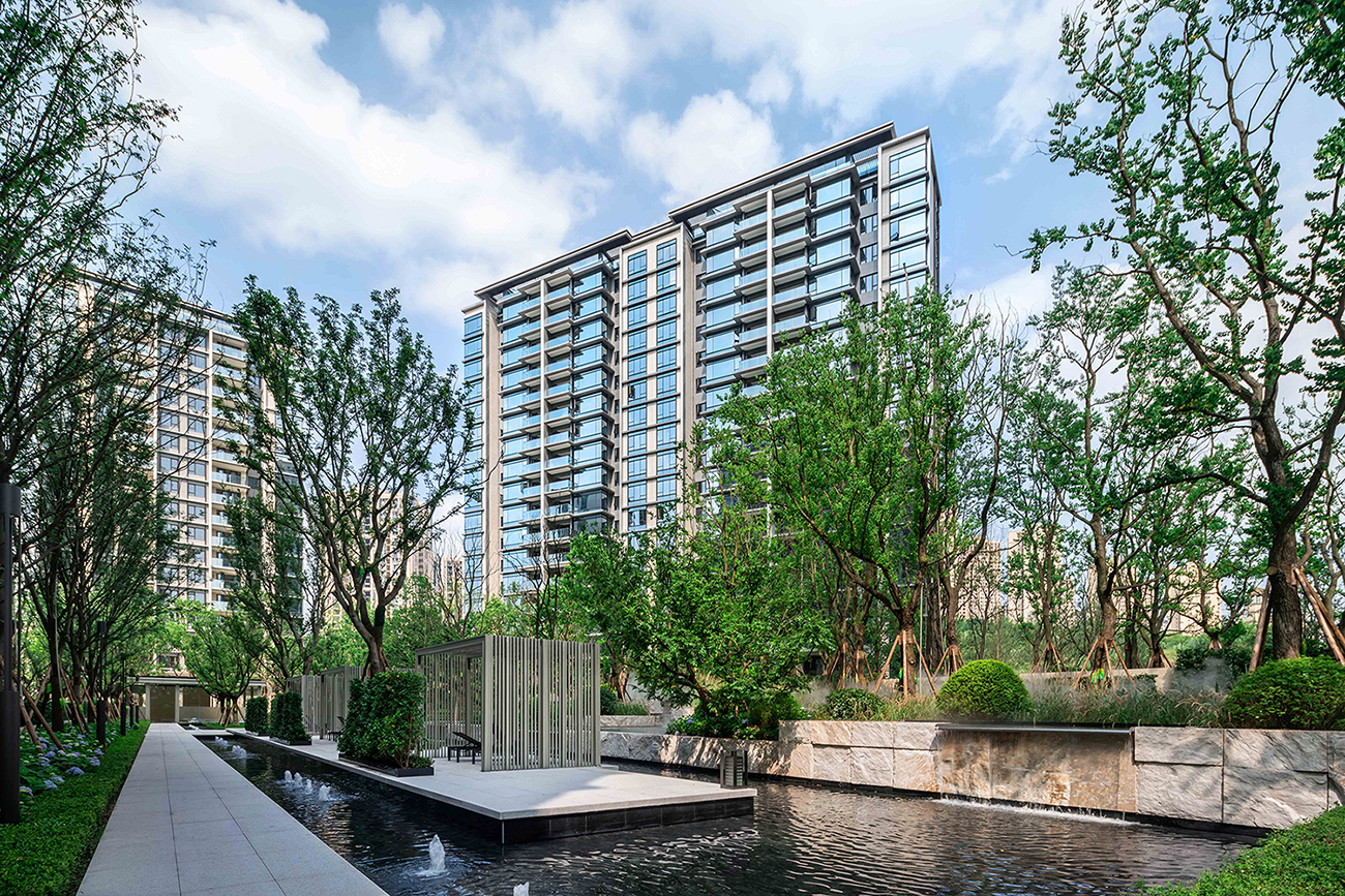 入口大門約5米高,兼以黑白大理石,盛啟森鏡門第之儀。開放水景等簡約現(xiàn)代設(shè)計,外圍擋墻采用2+1+1隔離布局,自稱高墻秘境,城囂隔絕門外,身心回歸森林秘境。