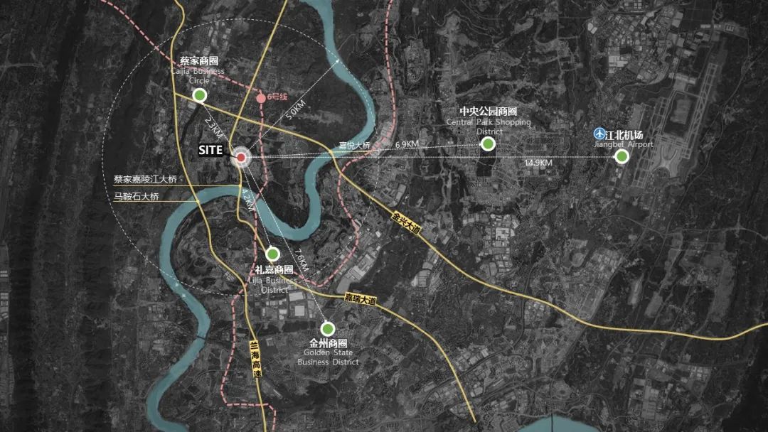 項目位于重慶市北碚區(qū)蔡家核心板塊,落于蔡家大橋橋頭,西臨嘉瑞大道,北側(cè)為公園綠地,南側(cè)與西側(cè)被農(nóng)林用地包圍??捎^嘉陵江江景,遠眺縉云山山脈。
