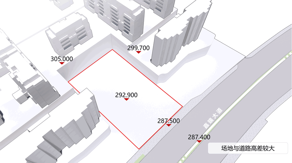 本案依山而筑,場地南北向高差約17米,東西向高差高達35米。基于場地條件,地塊臨嘉瑞大道西側(cè)為體驗中心的最佳且唯一的城市接駁點和人流導入點。利用地形高差,展示區(qū)與城市道路及樣板樓形成高差錯落的山地庭院景觀,鑒于周邊現(xiàn)狀條件的復雜性,我們認為采用“隱”是該項目規(guī)劃設(shè)計策略中主要處理手法。設(shè)計中在前場空間采用半圍合私密庭院來減少城市干道對于住區(qū)的干擾。