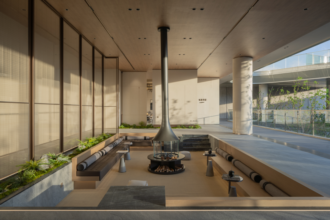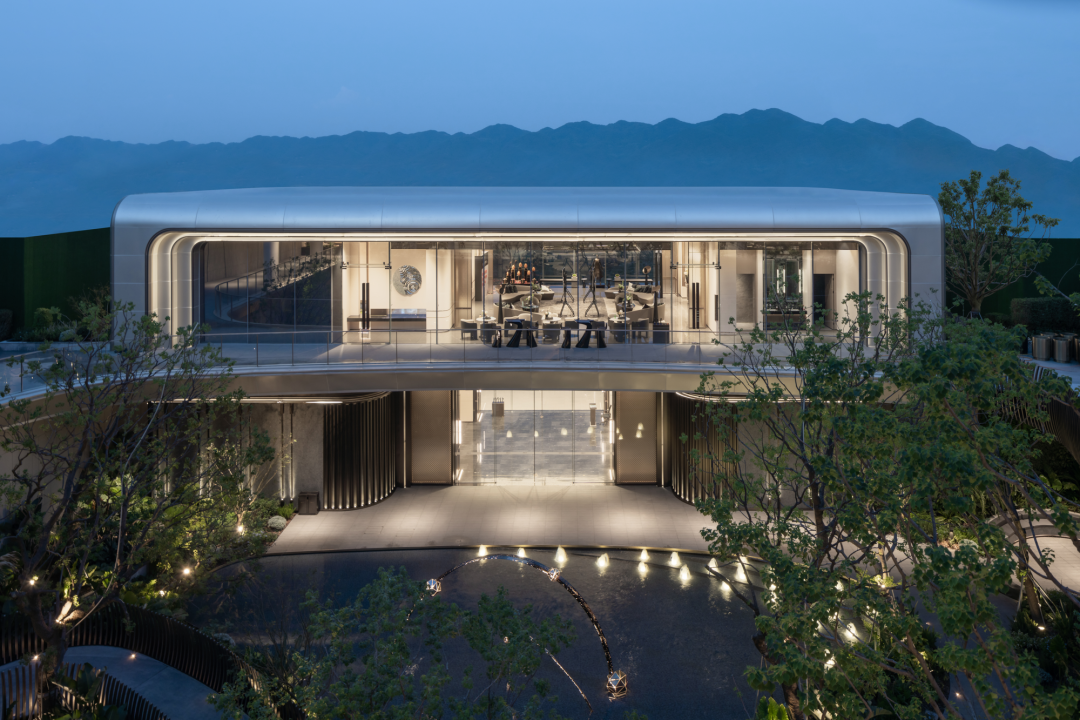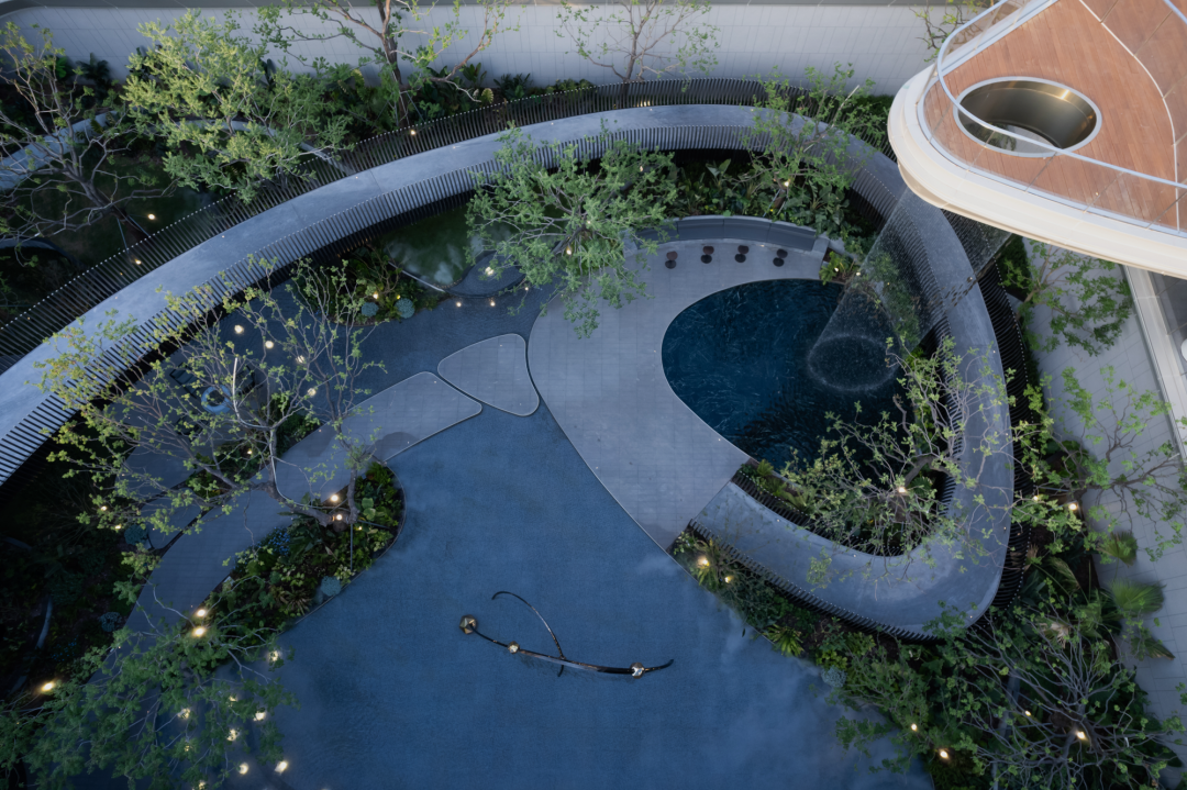 穿過大堂,漂浮、旋轉(zhuǎn)的下沉庭院構(gòu)成了流光水院的后場空間。后場景觀以行星繞日為設(shè)計理念,講述了瑩瑩星體的盤行軌跡。而大堂雖然只是一個建筑空間,但它卻是多個不同的場所。它不僅具有接待的功能性,還承接了內(nèi)外景觀資源,串聯(lián)起遠處的山脈與私密的下沉庭院,從庭院中回看,宛如一幅水墨畫般映入眼簾。