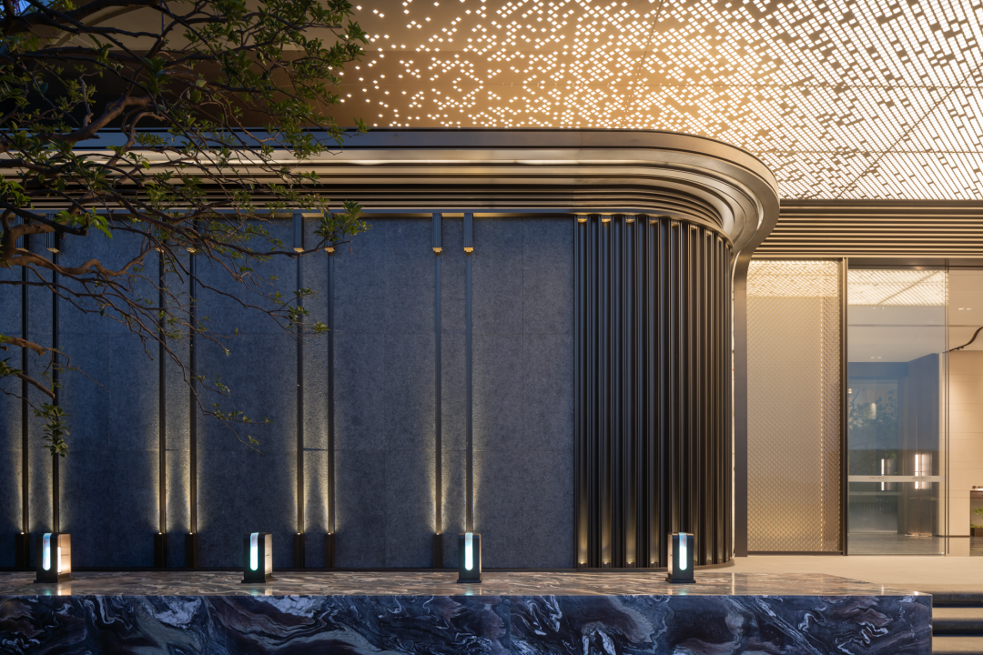 自城市道路抵達展示中心,就是一種由公到私的體驗過程,我們用三大主題場景空間,匠筑與實踐共舞的詩意居所。前場空間運用秩序的林徑于樹影婆娑之間,人們漫步于建筑入口,輕奢景墻環(huán)抱。明鏡的玻璃搭配精致的不銹鋼讓人仿佛置身于度假酒店的大門,下部近景的不銹鋼細節(jié)及夢幻的星空頂營造出典雅奢華的入口。