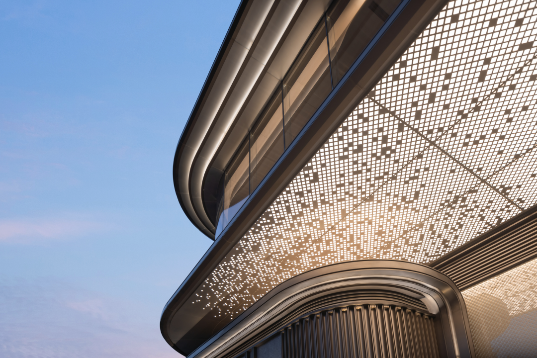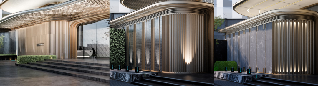 入口立面造型相比于單純的無銹鋼的材質(zhì),石材與無銹鋼相結(jié)合,利用無銹鋼作為條形格柵,使其更精致,呈現(xiàn)效果更均質(zhì)。幕墻頂部的有懸挑近兩米,雙曲面弧形收口處理,也是細節(jié)難點。