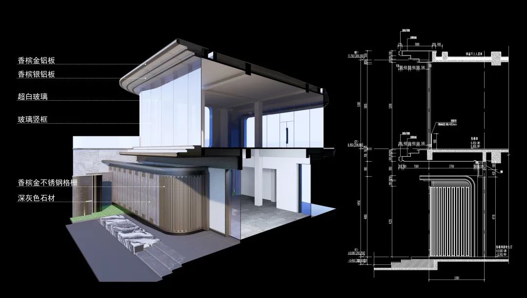 建筑體量的構(gòu)成關(guān)系則通過外圍香檳金及銀色鋁板線條和中間大面積超白玻體量之間形成一種包絡(luò)關(guān)系,同時又發(fā)生了一定程度的內(nèi)外收分,入口側(cè)則出現(xiàn)了干凈純粹玻璃盒子漂浮于基地之上的輕盈靈動空間效果。