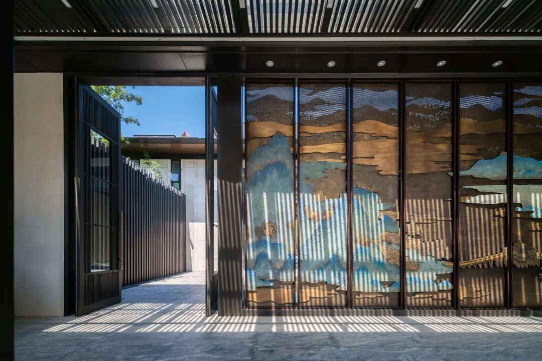 一進以北宋王希孟的《千里江山圖》啟幕,青綠山水,氣勢恢弘,為中國十大傳世名畫之一。設(shè)計汲取傳統(tǒng)美學(xué),賦予現(xiàn)代審美的轉(zhuǎn)譯,將作品中獨特的藝術(shù)感提取,留其濃麗,增以典雅,隔開城市的喧囂。