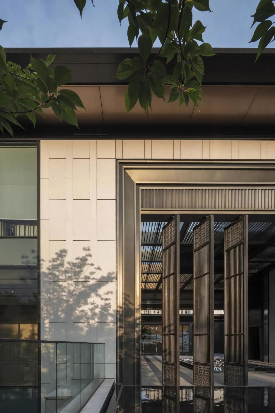如入境“府院”區(qū)域建筑立面貼磚未采用常規(guī)橫向的方式,而是采用了竹節(jié)式的拼貼,與色澤古雅的古銅色金屬構(gòu)架和不銹鋼拉絲面相配,輔以LED黃色柔性燈帶,呈現(xiàn)匠心精筑的美好人居。雖棄繁就簡,亦不忘琢磨細節(jié)。