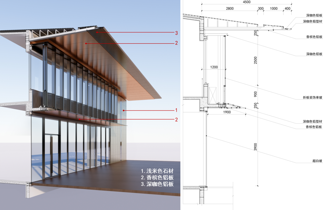 向外挑出的屋檐形成一處灰空間,檐下木平臺通向漂浮的休閑區(qū)域,在大面積的落地窗和寬闊的水域之間輕微增強了室內(nèi)外的界限感,而不影響自然景色的融入。延伸屋面為建筑增添了一絲古韻,側(cè)向形成框景的效果,強調(diào)了水平向的風(fēng)景感,以現(xiàn)代技術(shù)構(gòu)成輕盈之巧工。