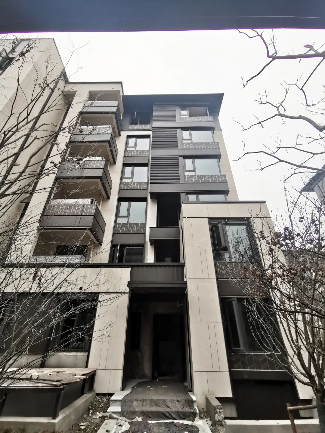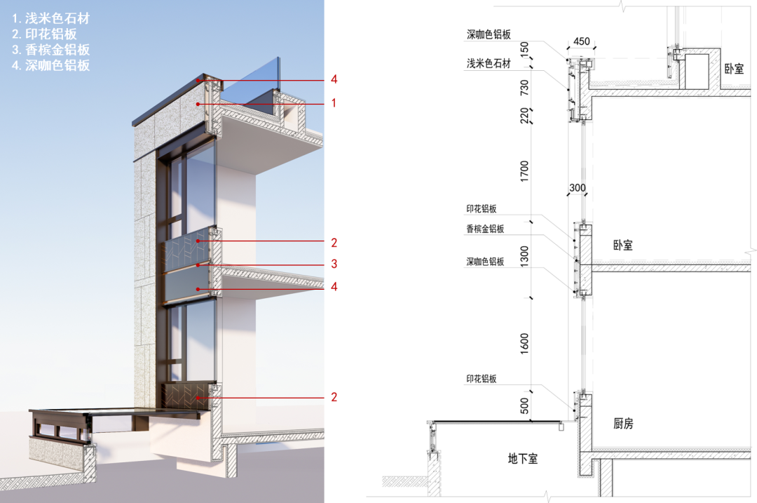 建筑細部融入了予以現(xiàn)代化轉(zhuǎn)譯的中式元素,窗臺裝飾以簡單別致的花紋,不喧賓奪主而獨具匠心。采用多種材質(zhì)弱化尺度,減弱深色帶來的壓迫感,香檳金色予以點綴。