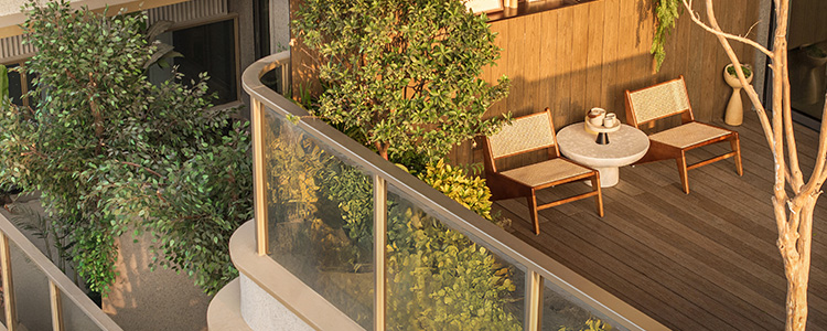 通過(guò)設(shè)置定向格柵及磨砂玻璃規(guī)避相鄰花園間的視線干擾