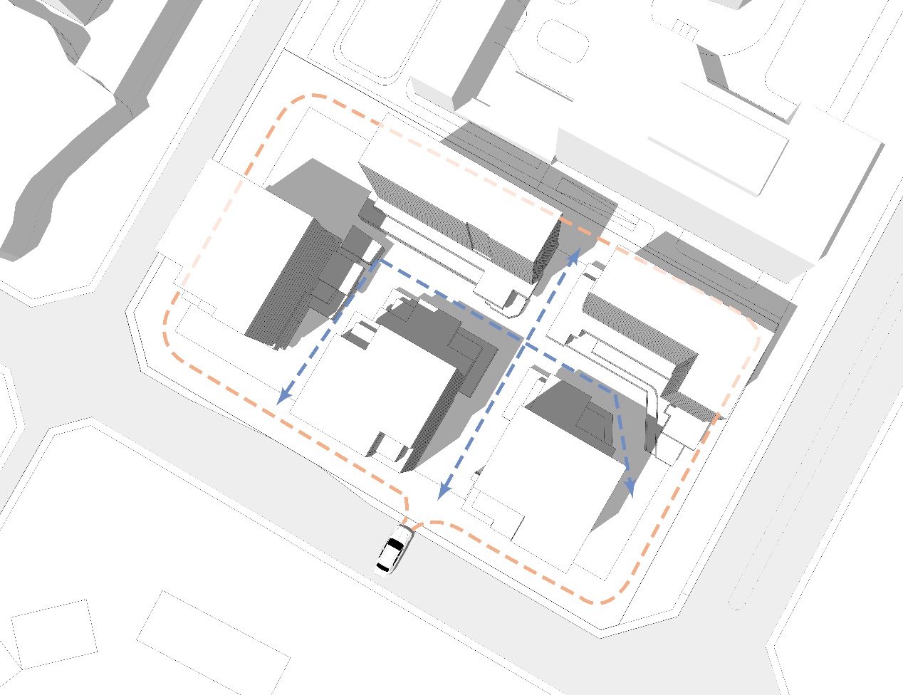 通過(guò)項(xiàng)目用地東西向的流線(xiàn)貫通,以更加主動(dòng)的姿態(tài)刺激街區(qū)人流聯(lián)動(dòng),落客區(qū)(建筑入口)與周邊環(huán)境實(shí)現(xiàn)本案“開(kāi)放式商務(wù)中心”的初衷。城市空間與建筑內(nèi)部空間的過(guò)渡上,充當(dāng)了兩種空間體系的緩沖空間,優(yōu)秀的外部空間設(shè)計(jì)更可以實(shí)現(xiàn)人流的引導(dǎo)以及空間的暗示,使得內(nèi)、外空間發(fā)生互動(dòng),增加了空間的趣味性。
