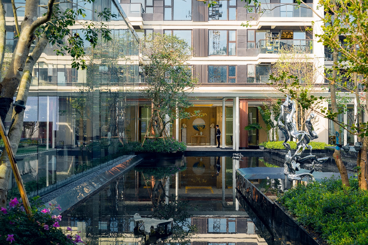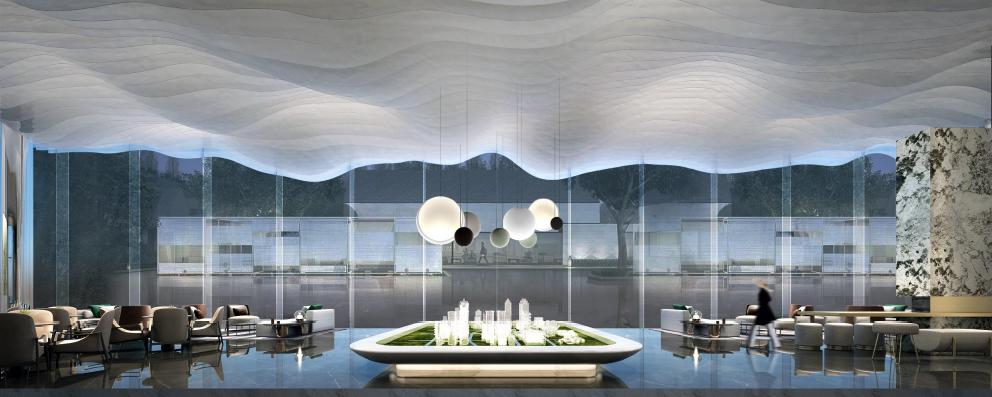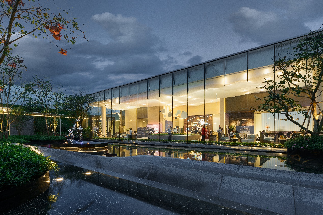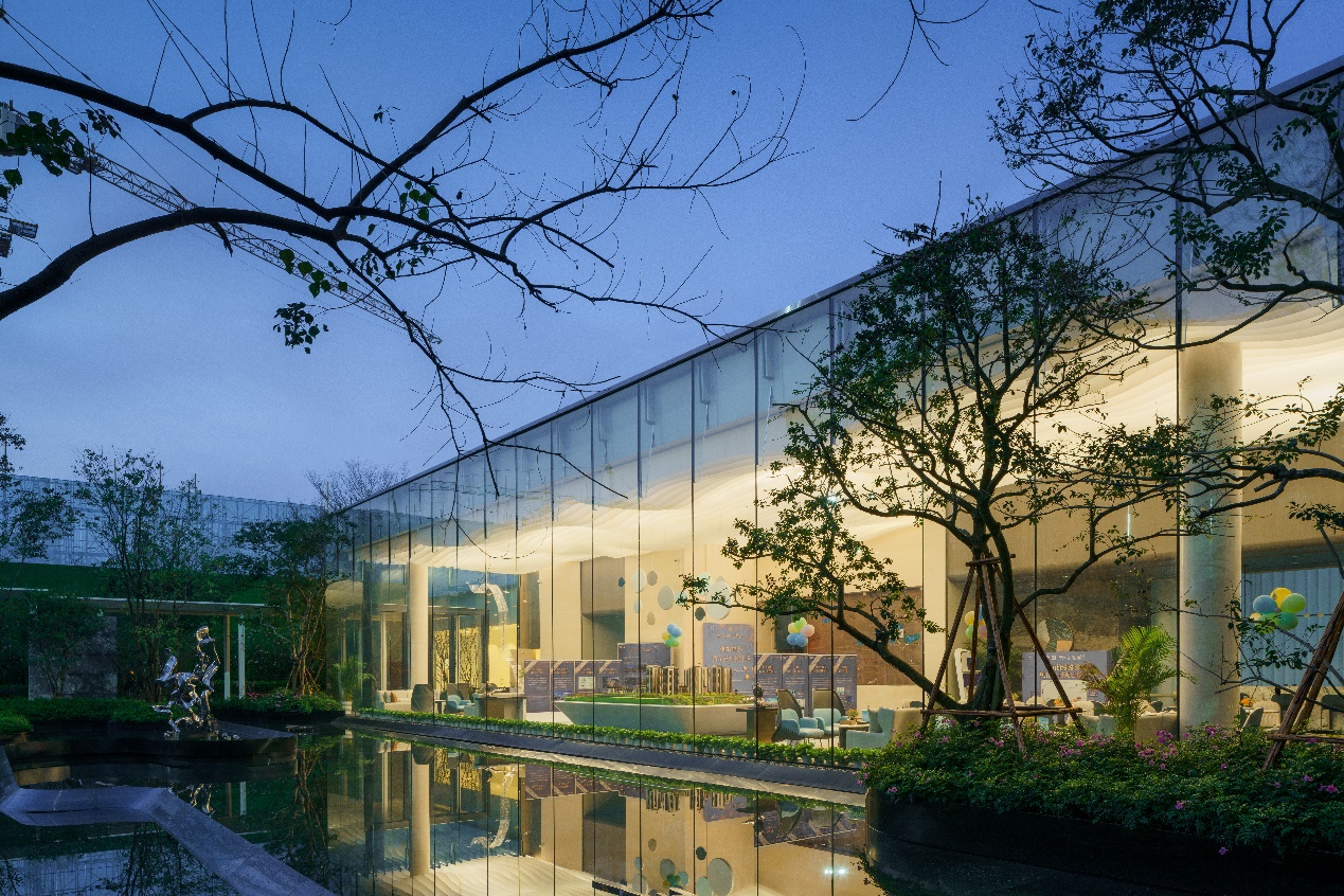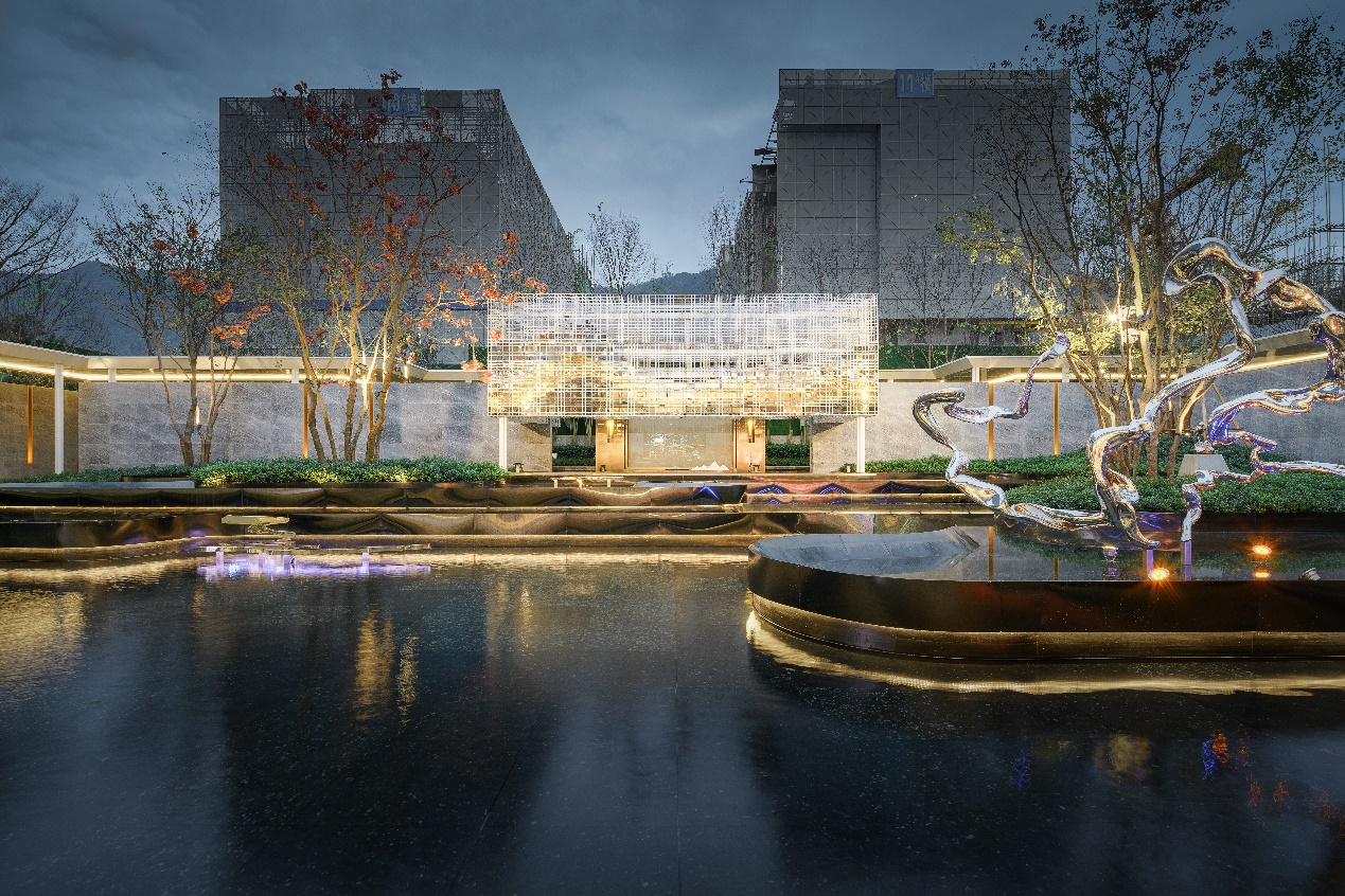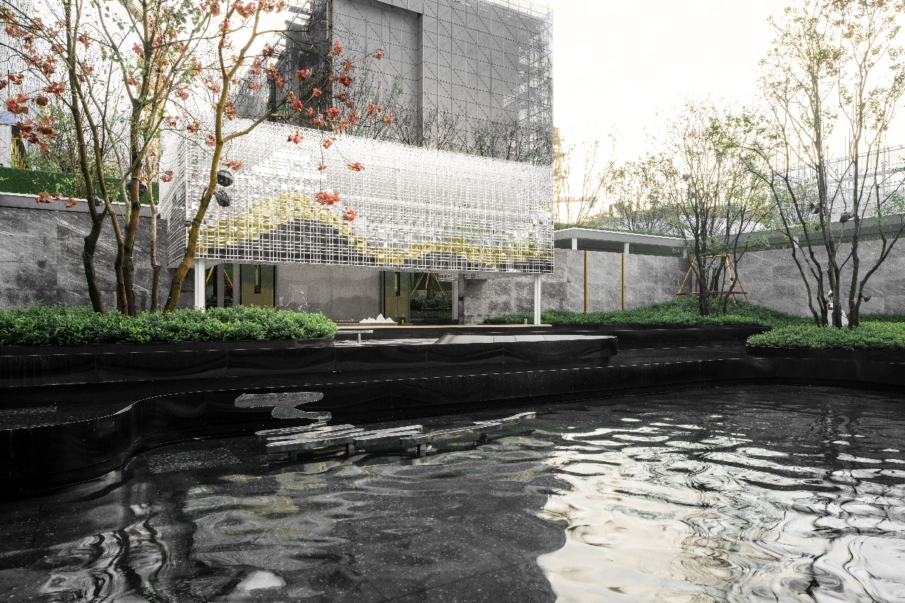 庭院是將建筑、山水、花木等元素通過藝術(shù)手法組合而成的建筑綜合體。“向心而筑”這種建筑空間形成了獨特的文化魅力,用來營造單體與群體空間。內(nèi)向性空間布局由其功能決定,在整個項目交通最便利,最佳昭示面的位置布置了展示中心,不僅僅達到了形象與功能的平衡,也達到了效率與體驗的完美結(jié)合。