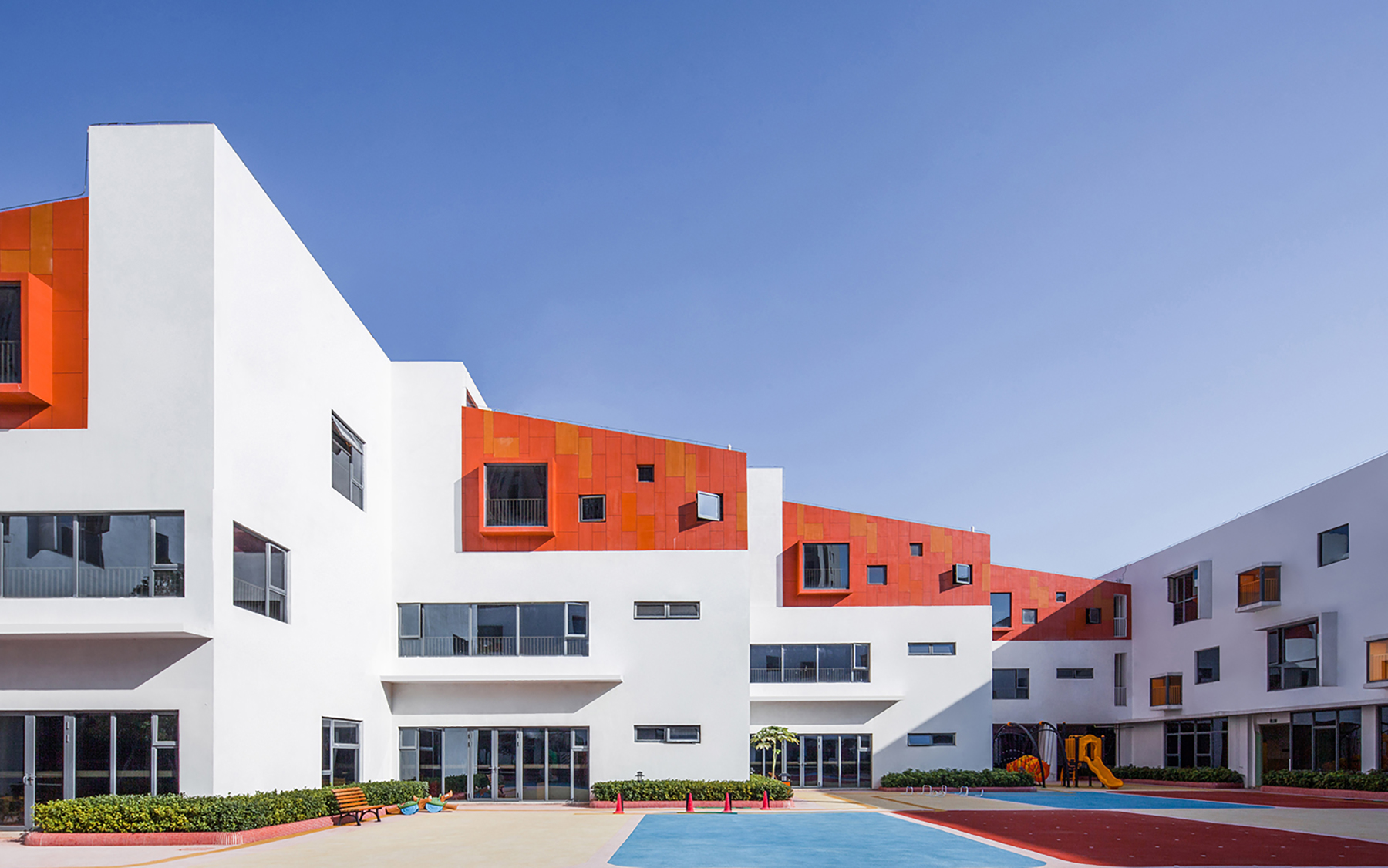 作為商業(yè)開(kāi)發(fā)項(xiàng)目的配建幼兒園,在建設(shè)成本和設(shè)計(jì)管理上都有它天然的局限性。設(shè)計(jì)師力求通過(guò)樸素的設(shè)計(jì)語(yǔ)言,以有趣的空間來(lái)組織功能,以明確的體量來(lái)塑造光影,在限制性設(shè)計(jì)條件下用心營(yíng)造一個(gè)“不受限”的兒童樂(lè)園。
