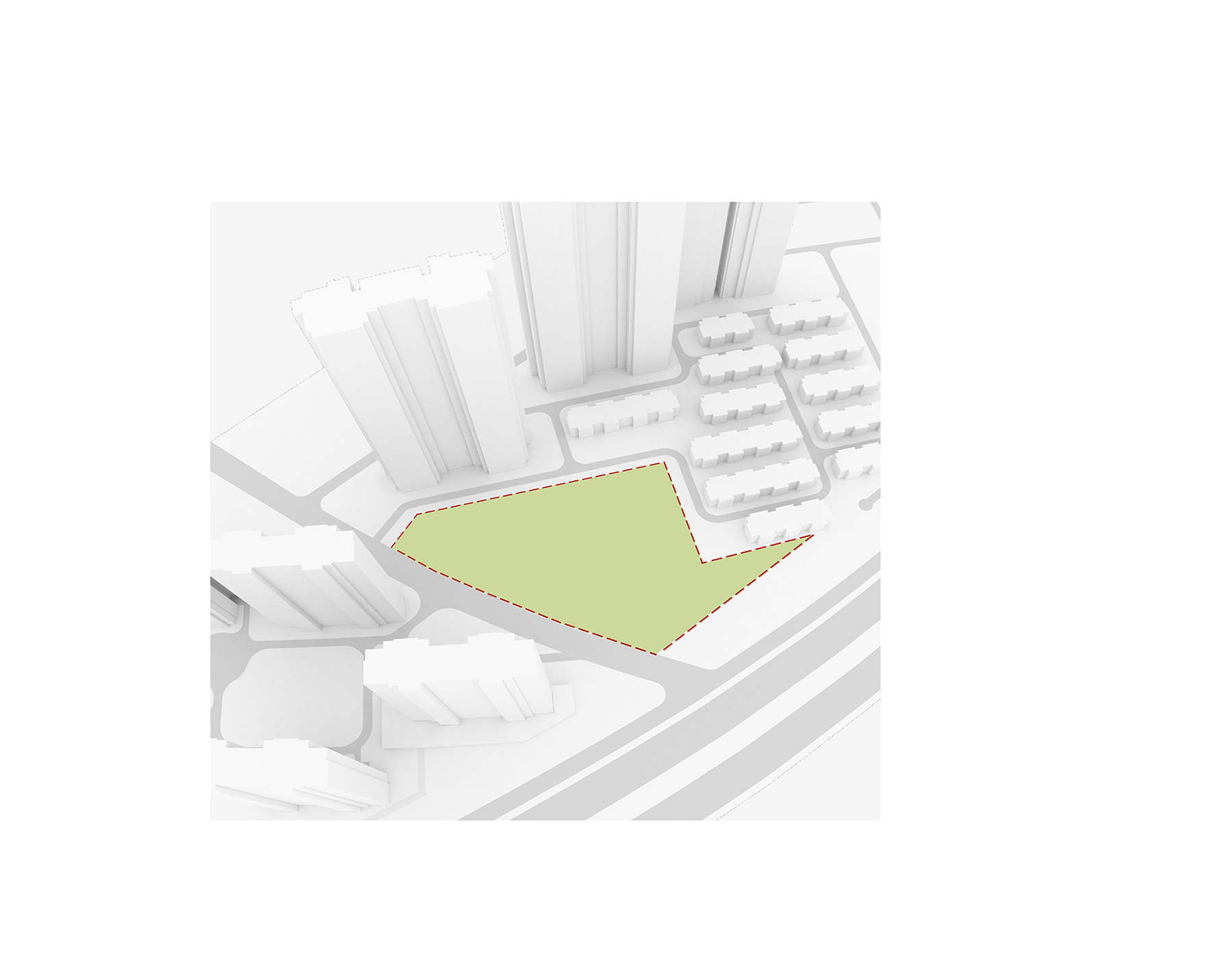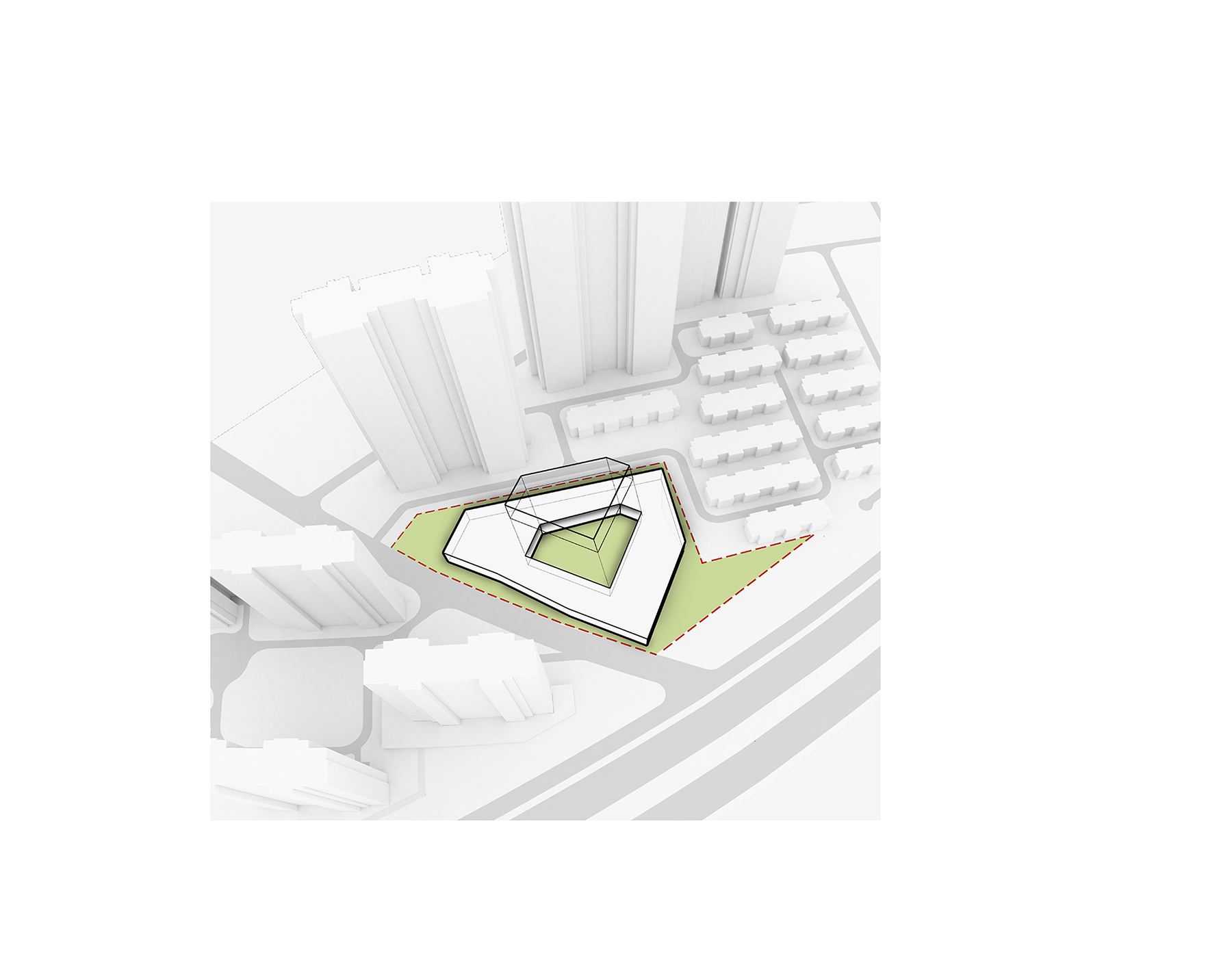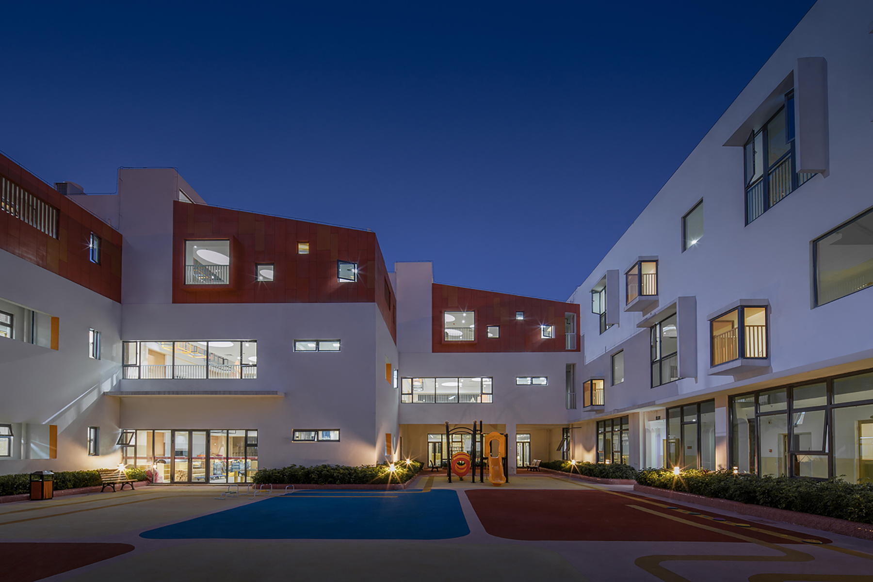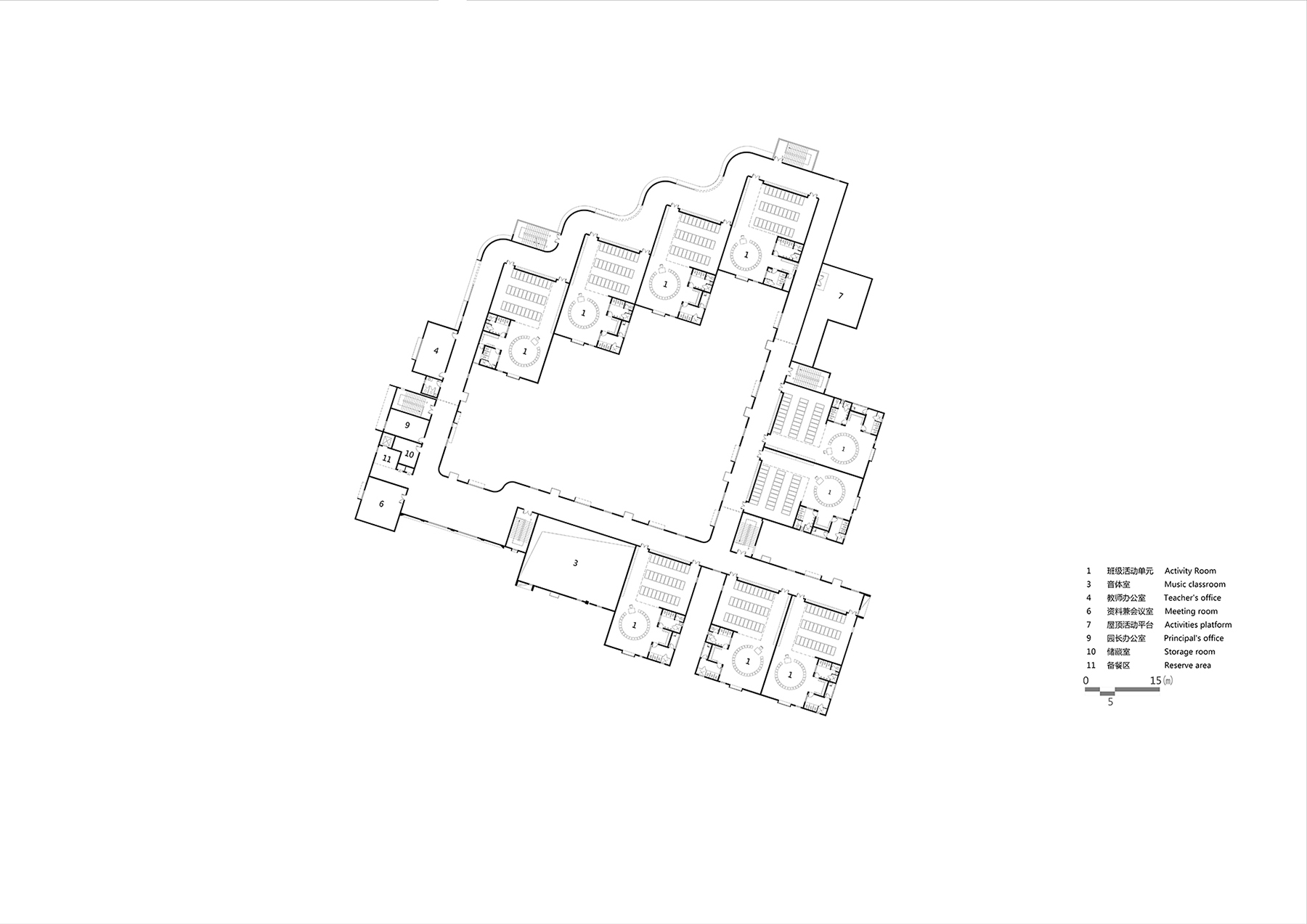 設(shè)計(jì)以“退讓”為核心策略,著力緩解幼兒園與周邊高層的對(duì)峙關(guān)系。建筑體量沿用地展開(kāi),以一種類似“甜甜圈”的形態(tài)圍合成一個(gè)內(nèi)聚性中心庭院,所有班級(jí)單元及輔助用房均圍繞該庭院展開(kāi)。中心庭院為小朋友們提供了一個(gè)安全內(nèi)聚的游戲場(chǎng)地,并為日常全園性集中活動(dòng)提供了空間。