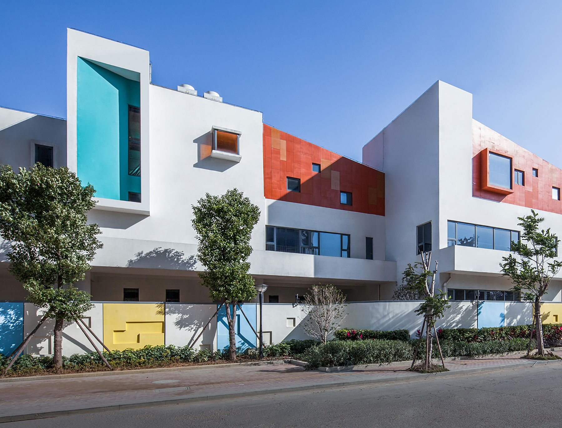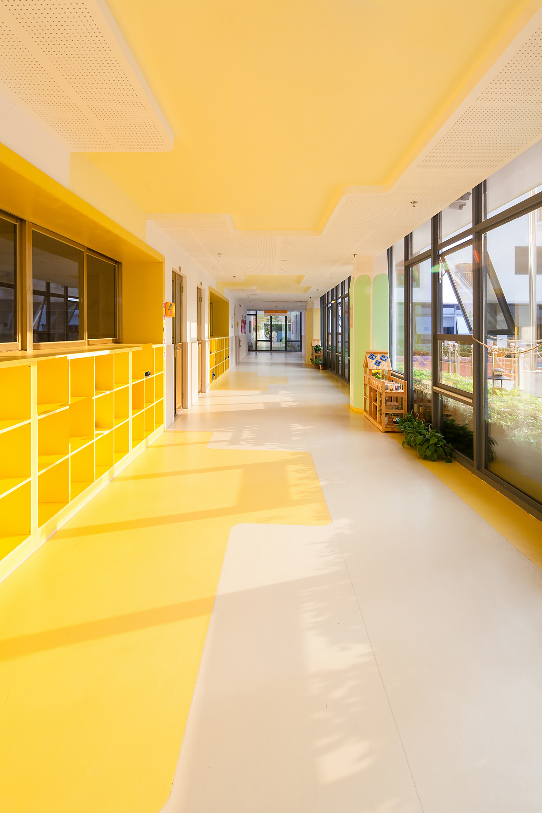 設(shè)計(jì)師給三層的每一個(gè)班級(jí)單元都設(shè)置了彩色天窗,期望每天早晨的陽(yáng)光透過(guò)天窗投射到活動(dòng)室的白色墻面上,產(chǎn)生如七色彩虹般的光影效果。這面墻將成為小朋友們的天然調(diào)色板,從早晨到傍晚,隨著時(shí)間變幻出不同的色彩和圖案。