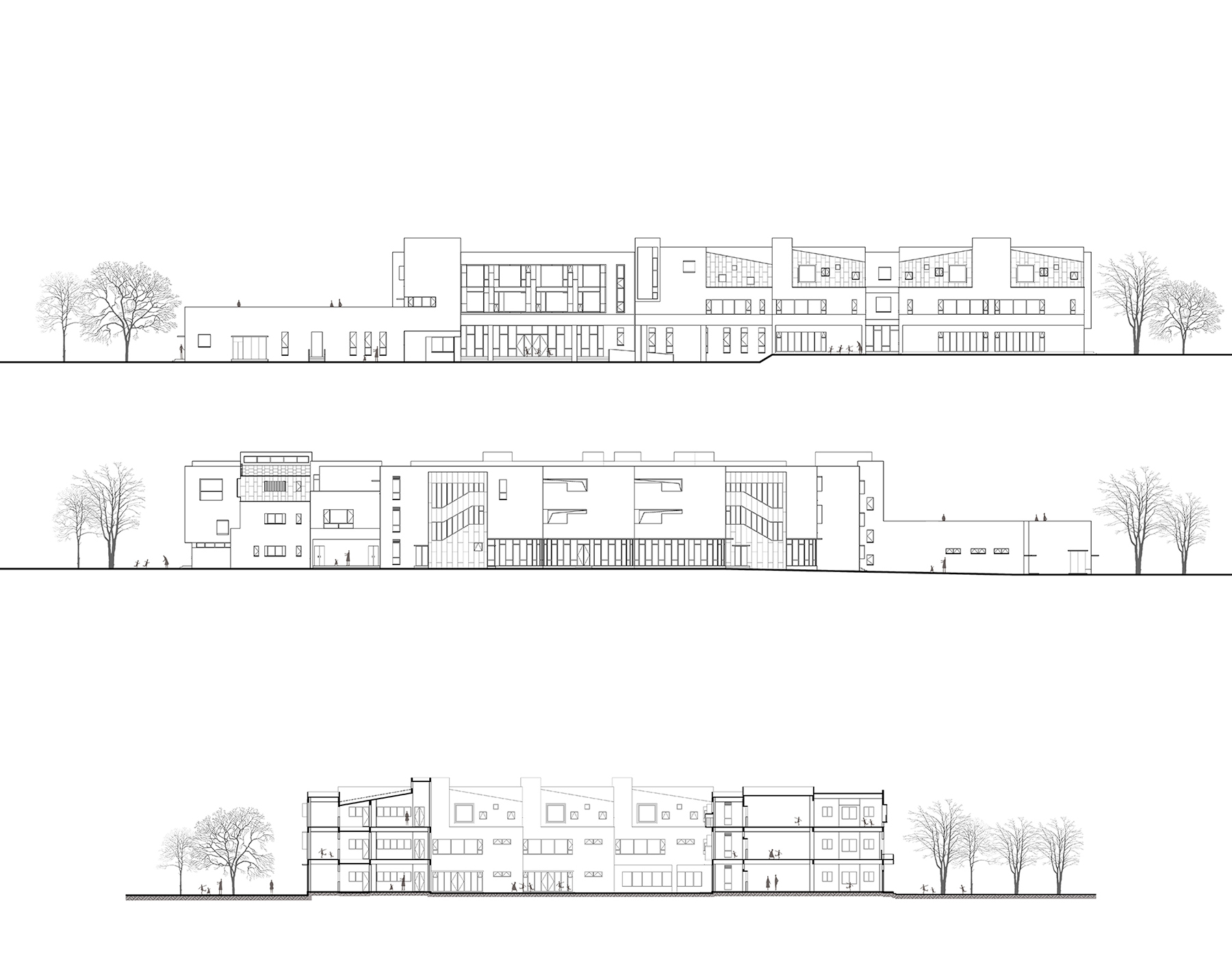 標(biāo)準(zhǔn)班級(jí)單元采用了形體簡(jiǎn)潔的單坡屋頂,坡屋頂對(duì)于小朋友們來(lái)說(shuō)是就是“房子”或“家”最典型也是最抽象的表達(dá),它是一種建筑符號(hào),也是一種情感媒介。坡屋頂不同的組合方式形成了豐富的建筑立面效果,也為周邊高層住戶提供了有趣的園區(qū)“第五立面”。