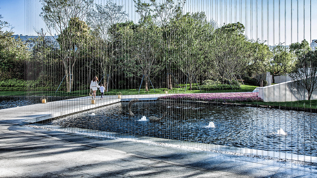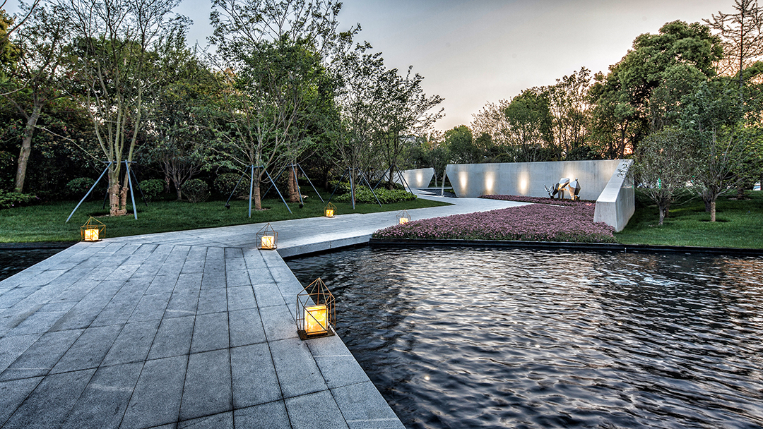 鏤空效果的藝術(shù)裝置安置水中,在水面上靈動(dòng)自如,靜透著現(xiàn)代設(shè)計(jì)的神韻風(fēng)神,簡(jiǎn)凈且自適。
