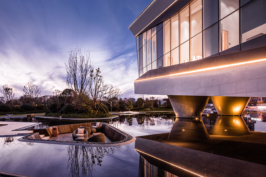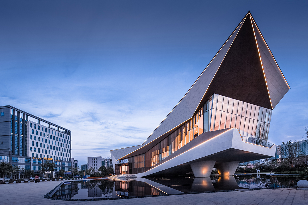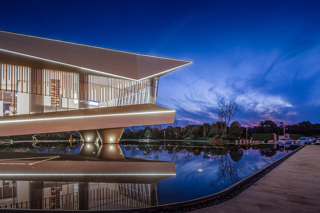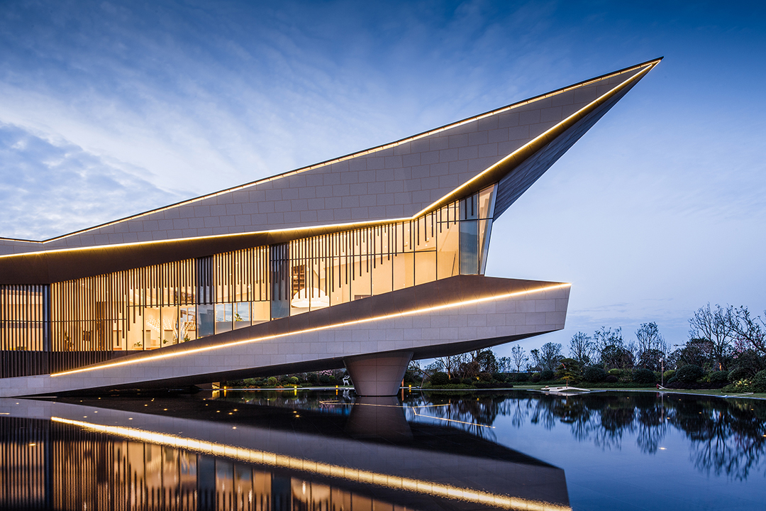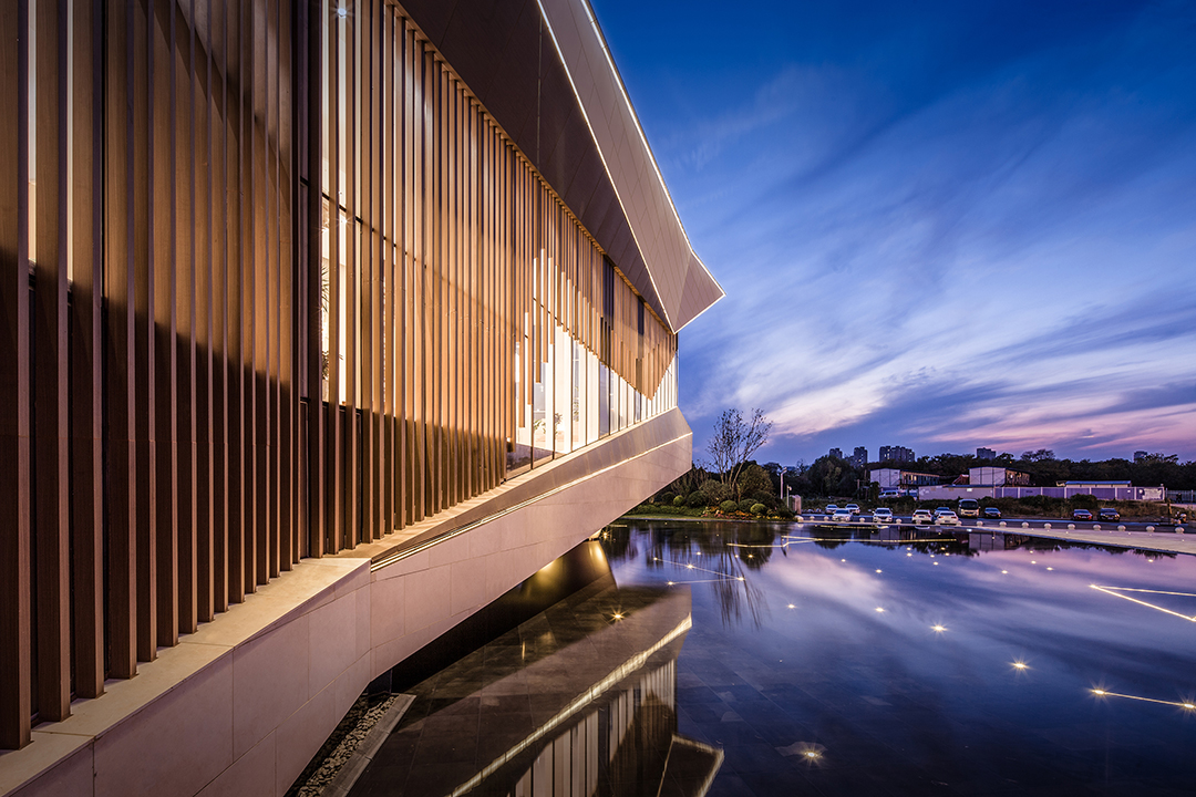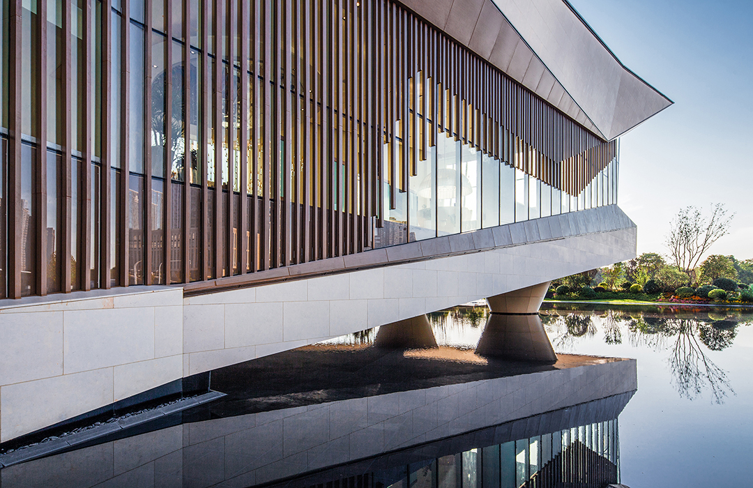 以仿生的手法,利用鋁方通豎條狀序列形成肌理,紋理以翅膀上羽毛為原型,整個(gè)建筑物表現(xiàn)出折面雕塑般的動(dòng)態(tài)整體性。水的出現(xiàn)模糊了建筑內(nèi)和外的界限讓建筑跟環(huán)境充分融合。