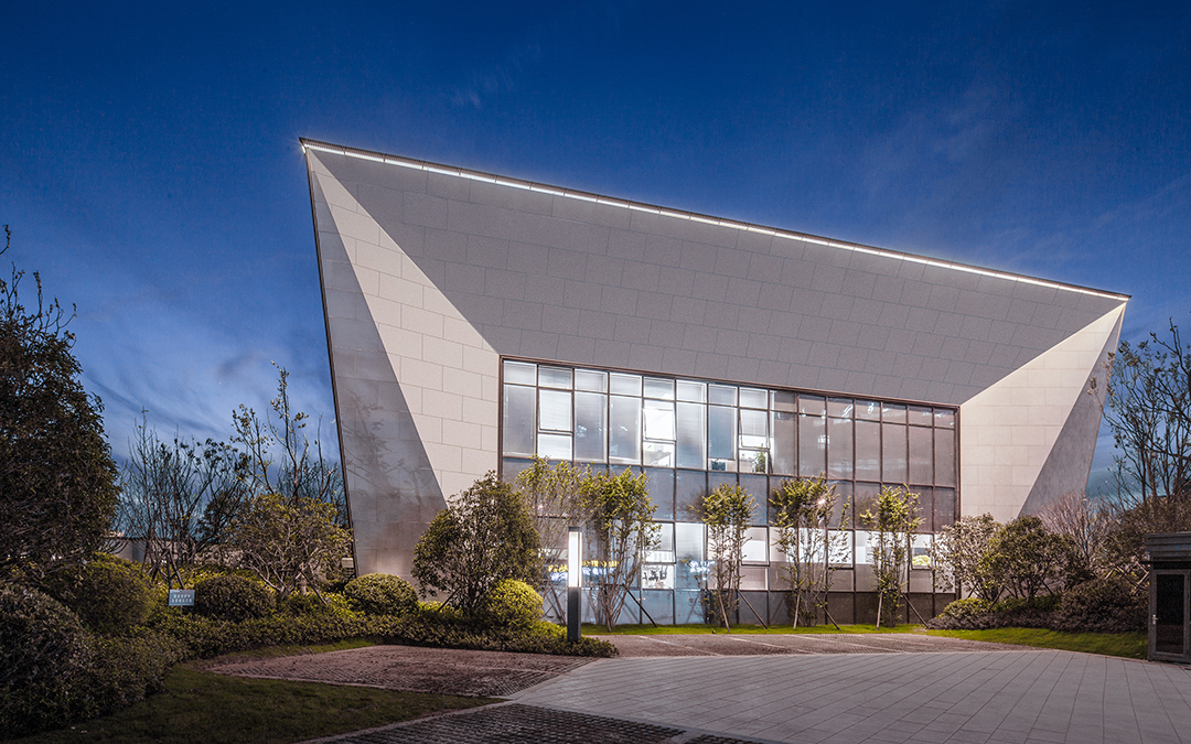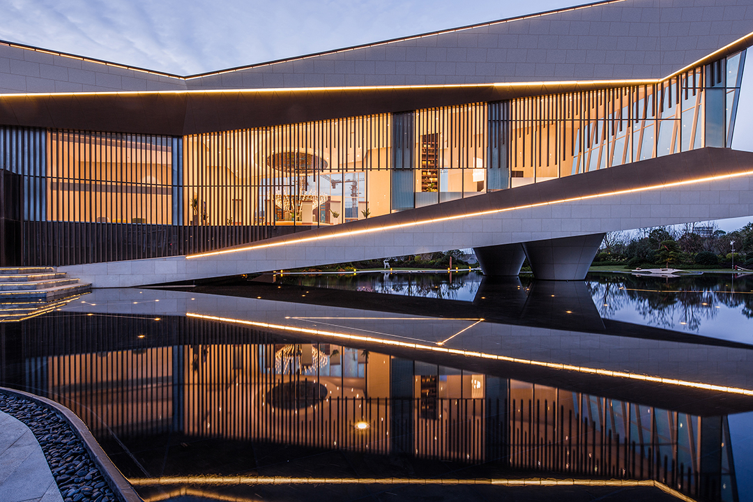 建筑的邊界輪廓使用極簡(jiǎn)線型燈帶,在星空之下顯得格外閃耀分明。外立面使用的三種不同材料層層遞進(jìn),更具層次感,使建筑在夜晚更晶瑩剔透。