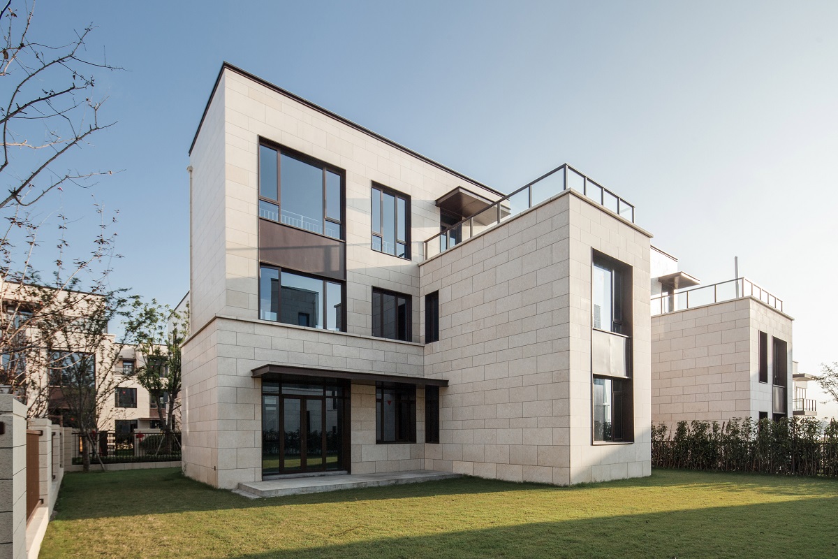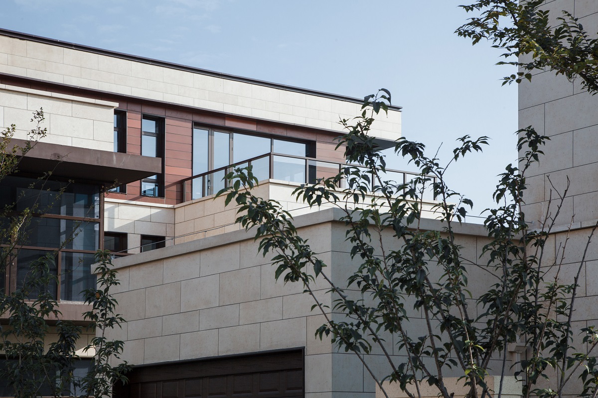 立面以現(xiàn)代手法為主,結(jié)合中式院落格局,穩(wěn)重大氣,整體感強。底層到局部采用石材,無大量裝飾性構(gòu)造,顯得格外的自然清雅,頂部則用仿石涂料。強調(diào)形式與功能的統(tǒng)一,豐富建筑美感,與自然環(huán)境的協(xié)調(diào)是生態(tài)美學(xué)的基本標準,才能使建筑真正 “生長”于環(huán)境中。