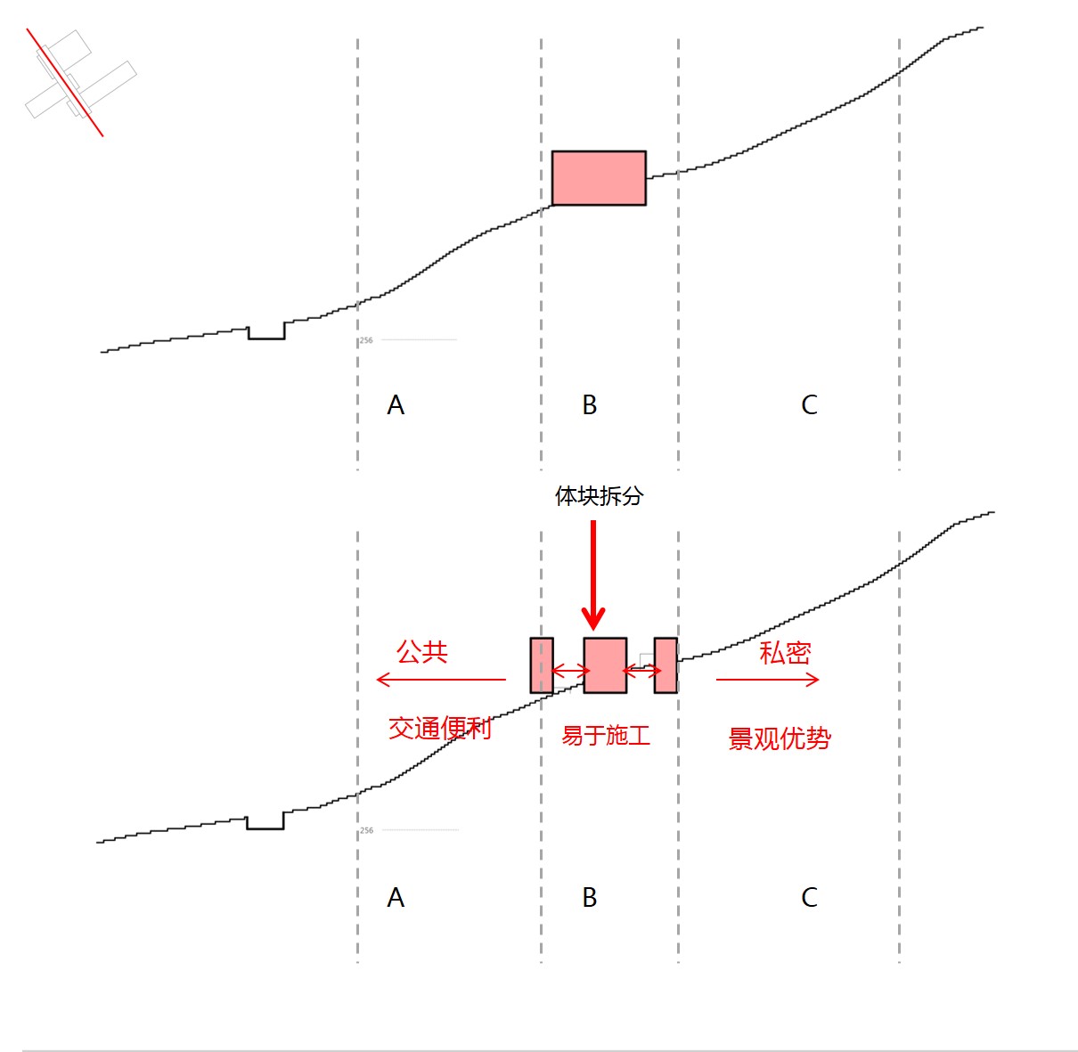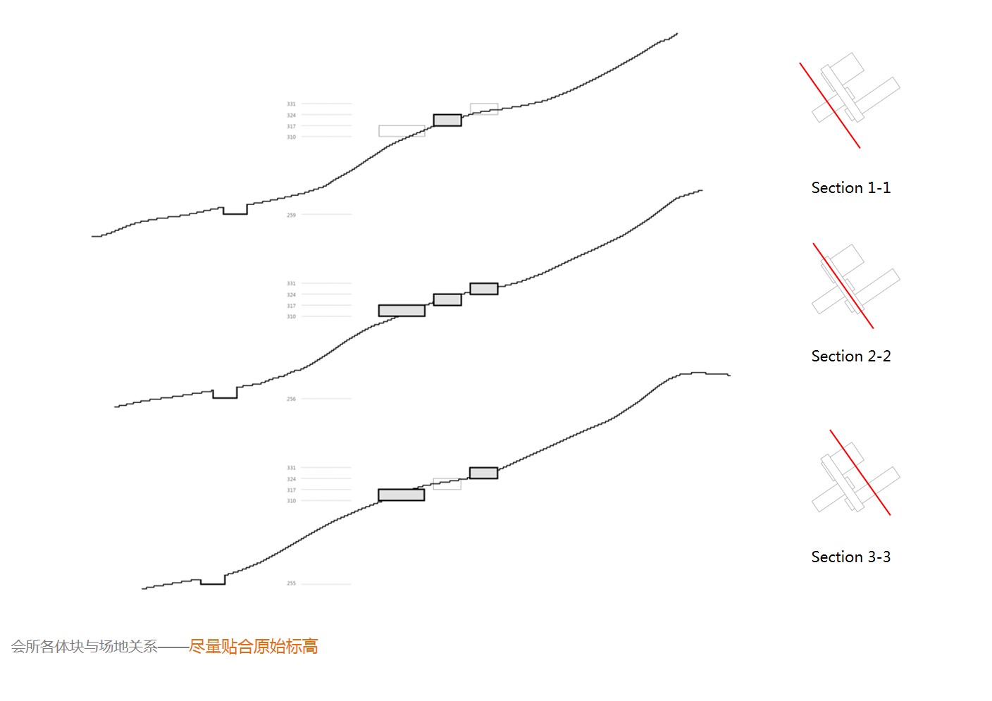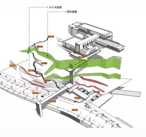 項目是地下一層,地上五層,高度約為23.7米的多層建筑,建筑體依據(jù)地形分成三個平臺拾級而上,同時地塊北側(cè)有作為垂直交通的觀光電梯塔,高度50米。