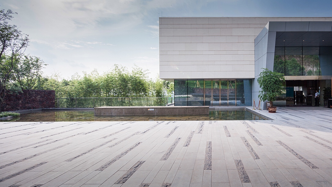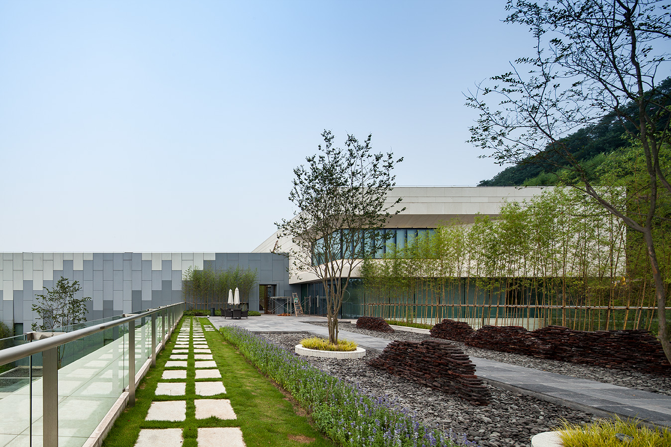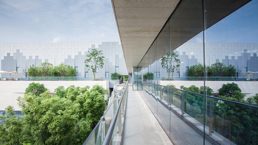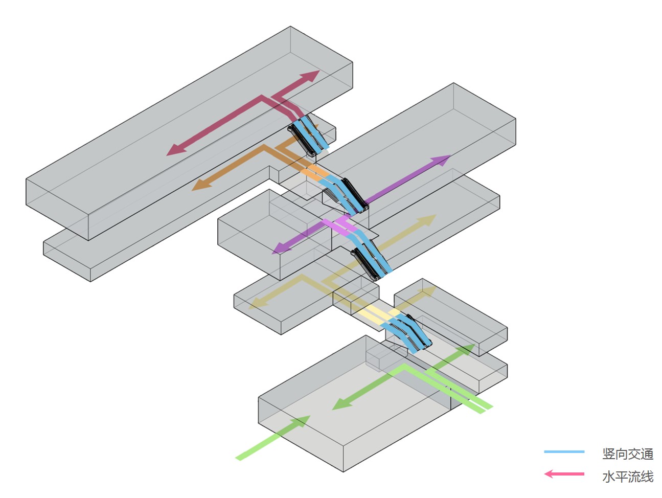 項目是地下一層,地上五層,高度約為23.7米的多層建筑,建筑體依據(jù)地形分成三個平臺拾級而上,同時地塊北側(cè)有作為垂直交通的觀光電梯塔,高度50米。