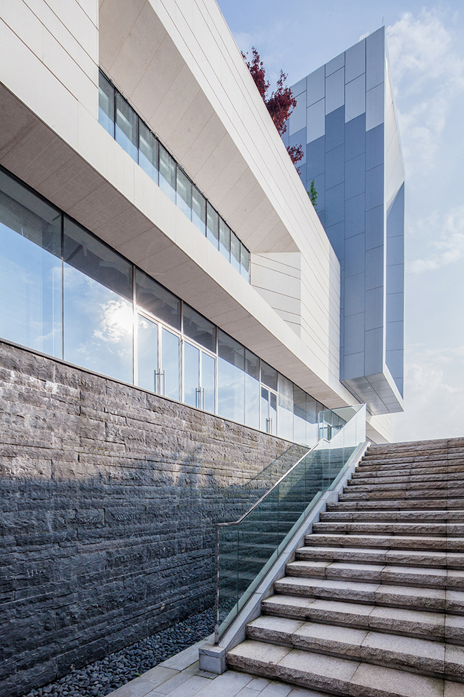 空間與形式的關(guān)系,是建筑藝術(shù)和建筑科學(xué)的本質(zhì),在這座小型綜合體中,包含了功能不一的建筑體量,一層功能為室內(nèi)、室外泳池以及健身,室外無邊際泳池與環(huán)境融為一體;二層功能為劍道中心以及泳池上空;順著中央大臺階拾階而上,第三層展現(xiàn)在眼前的是藝術(shù)中心以及多功能廳,三層室外露臺(室內(nèi)泳池屋面)為室外展示場地,可以在氣候適宜的季節(jié)進(jìn)行室外展覽。第四層的功能為生態(tài)展示中心。并以貫通南北的大通廊組織建筑內(nèi)部交通,室外以臺階、坡道以及電梯塔組織場地交通。