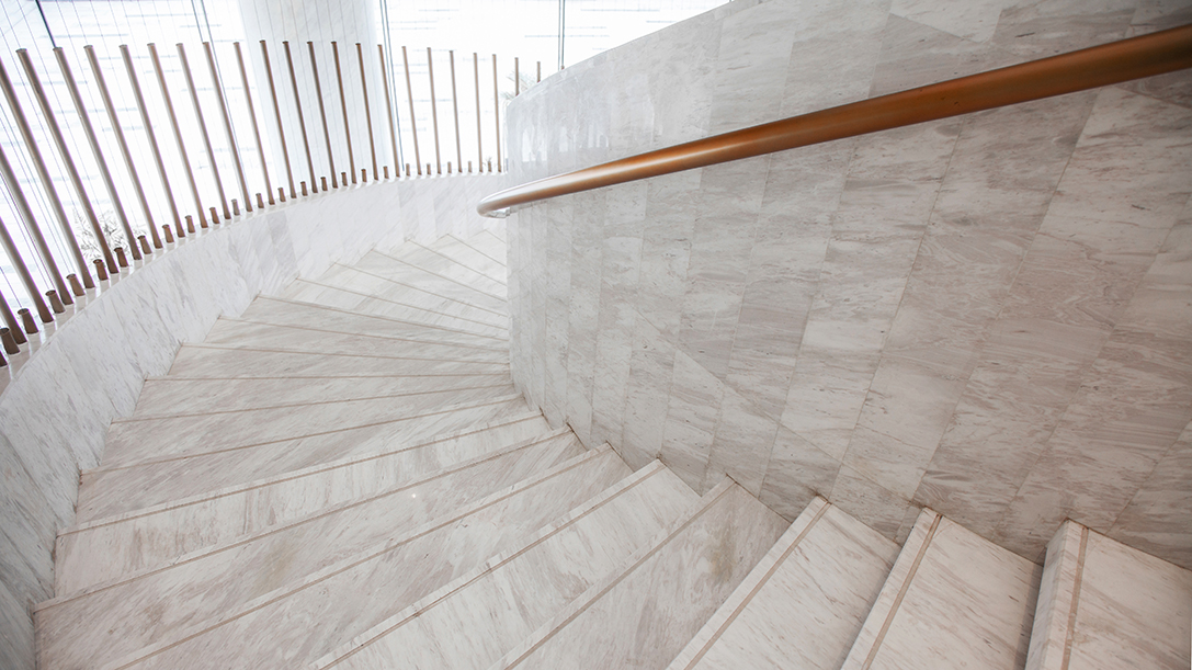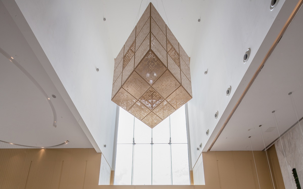 建筑內(nèi)部純白的空間,搭配長而緩上的旋轉(zhuǎn)樓梯制造出內(nèi)部空間在意識上迂回繚繞的戲劇性空間效果。人可以悠然漫步于室內(nèi)空間中,達(dá)到體驗內(nèi)部空間過程與情境的目的。三米見方的魔方體被懸掛在大堂的中軸線上空,鏤空的藝術(shù)圖案透過光孔層層映射,至上而下地傾灑在整個大堂空間。而一系列精細(xì)雕琢的藝術(shù)裝置儼然成為了空間藝術(shù)的一部分。