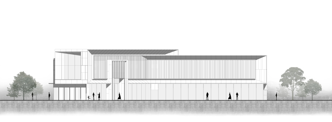 采用內弧形超尺度入口偏置,增加頂部細節(jié)添置趣味空間,進一步增強導視性及昭示性,保證視線集中,結合灰空間打造更具儀式感與品質感的入口。