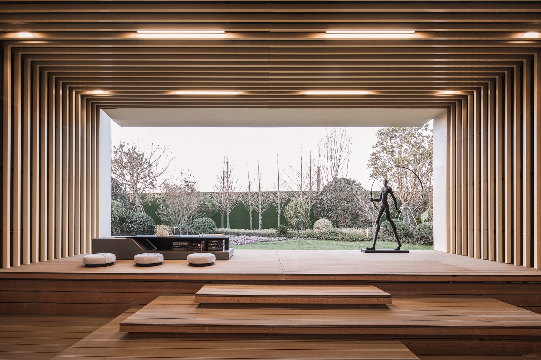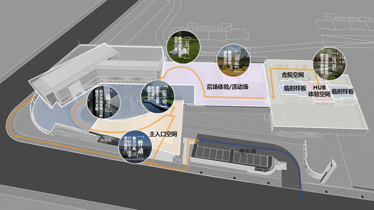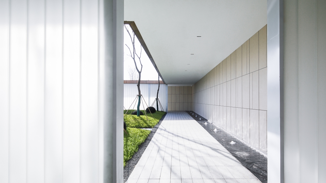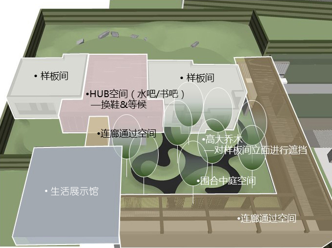通過連廊圍合出中庭空間,以動線首先穿過連廊,進入生活展示館,再穿過一段廊架進入HUB空間,半圍合式的布局在保持整體一體化的同時,也圍合出多層次的隱密之所。換鞋&等待,可進入兩邊的樣板間。