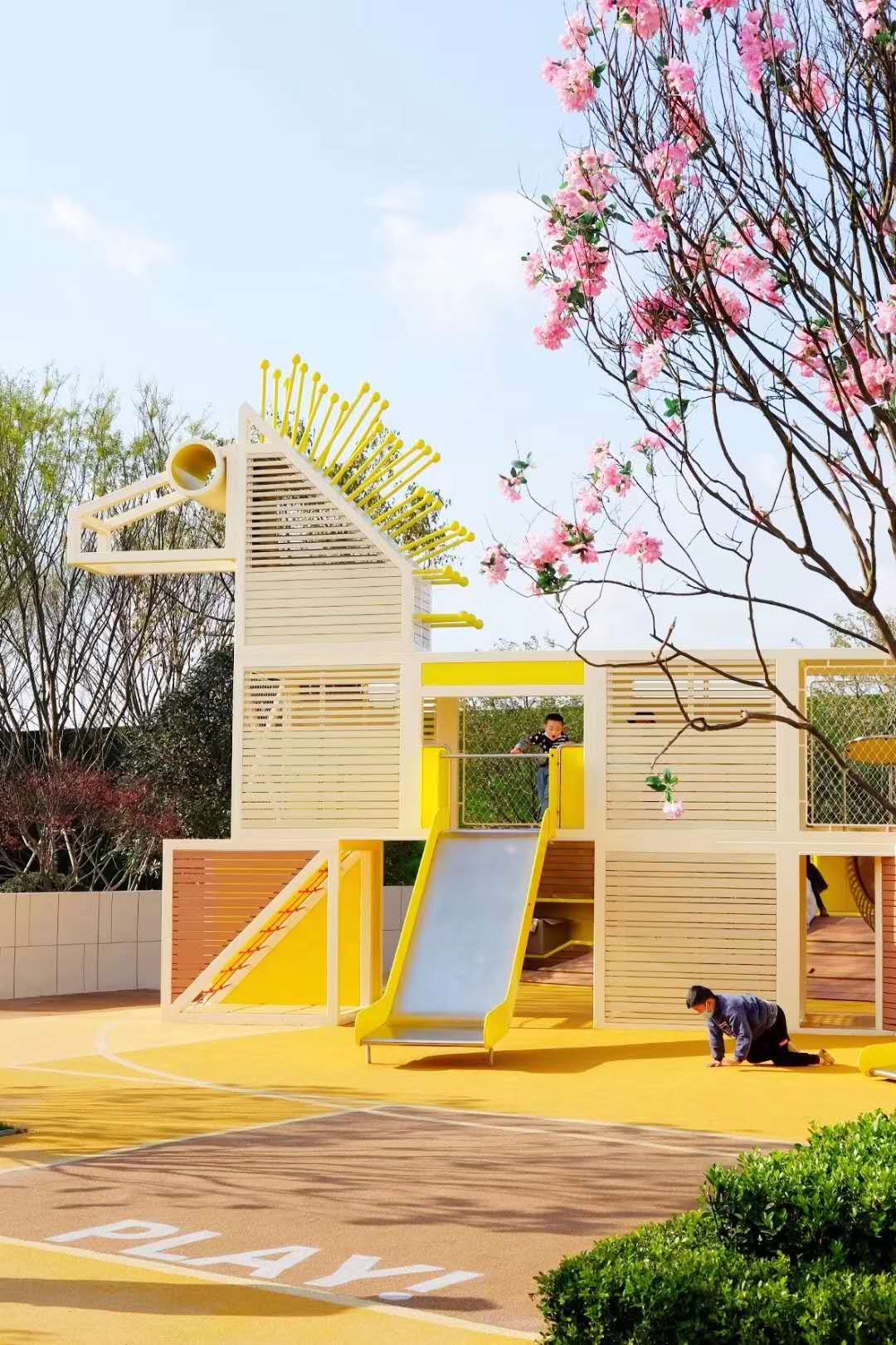 將動態(tài)的實物以靜態(tài)的載體由美學的設計要素運用到樂園之中,讓兒童直接徜徉在夢幻童話中,感受主題性童夢童享的魅力與生命力。開敞空間在游戲區(qū)域的圍合邊上均設置出口,強調空間的共享,使游戲區(qū)域與周圍環(huán)境相互融合,相互滲透。