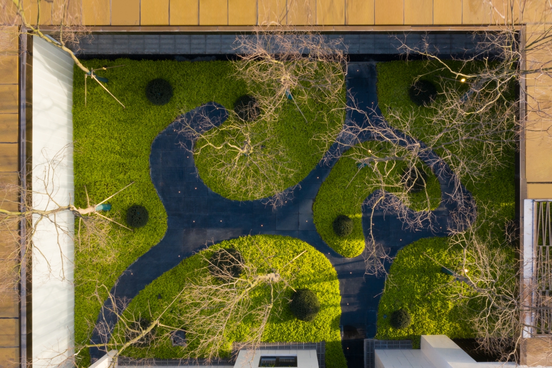 融入傳統(tǒng)圍合造園手法來營造現代手法的表現,一步一看、一框一景、打造游走山林般的體驗空間。從視覺、聽覺、多層次,多維度打造流水,綠島,植物。