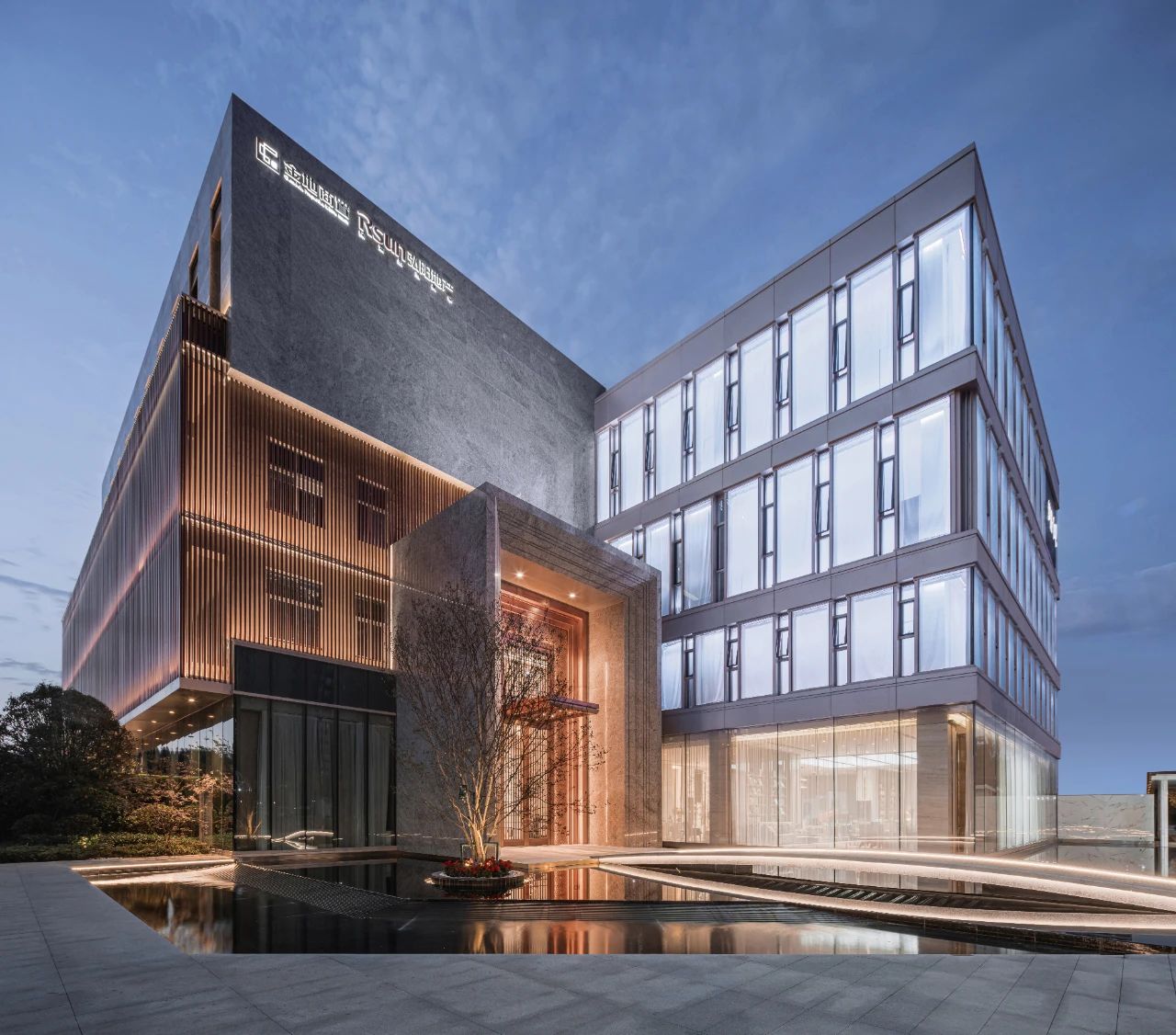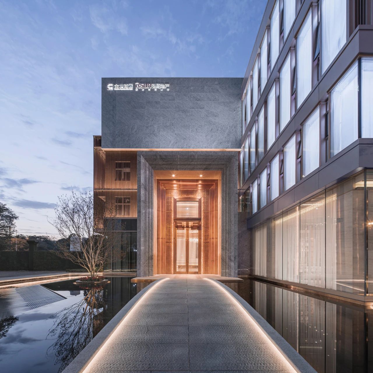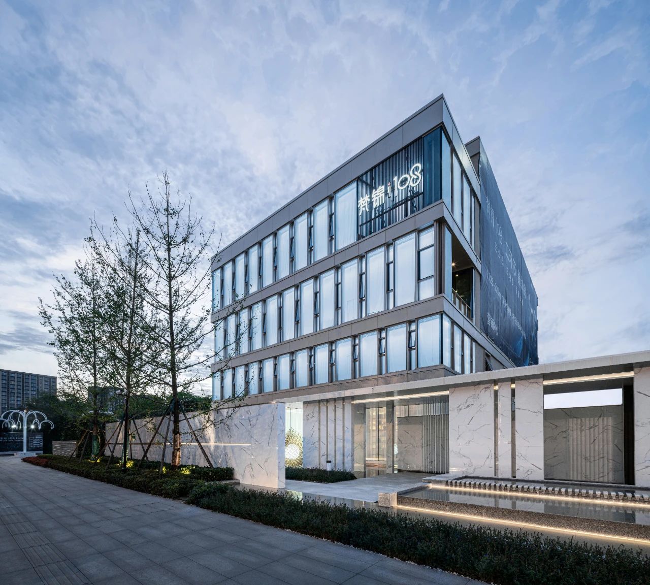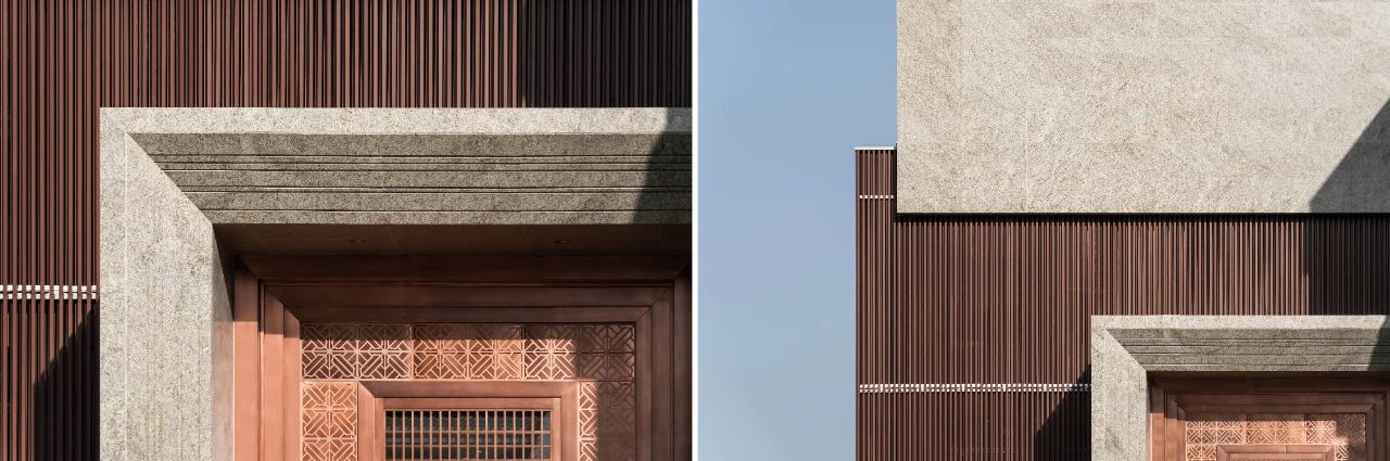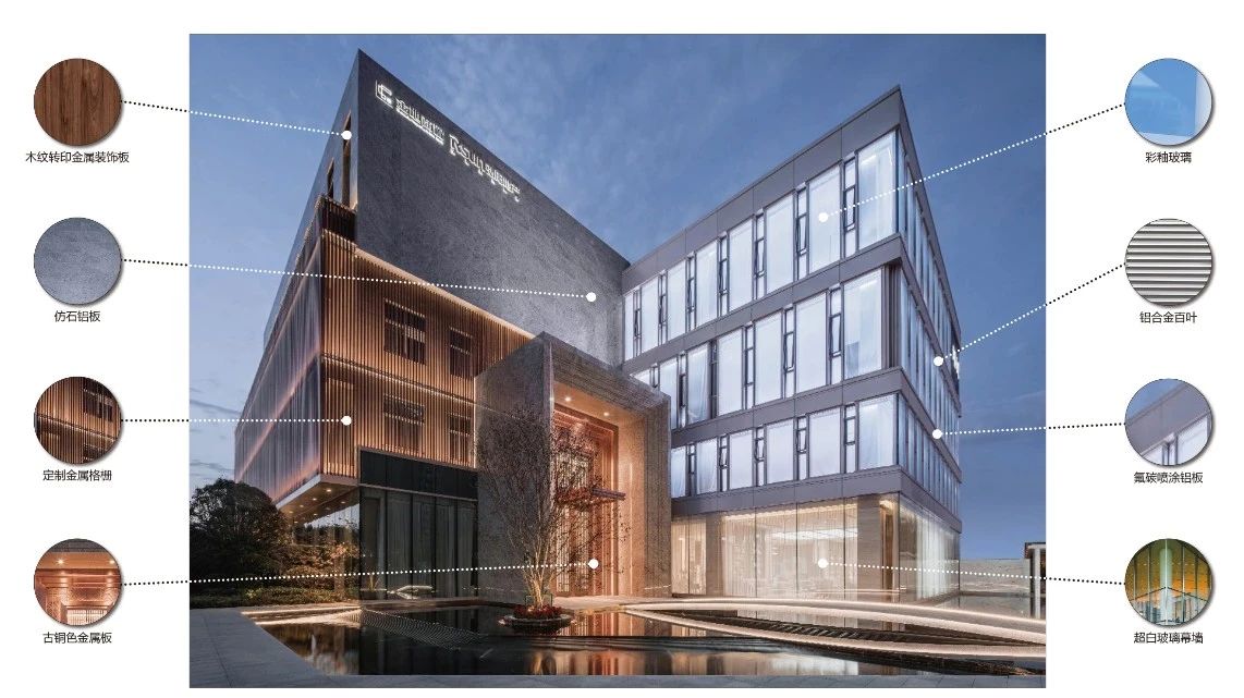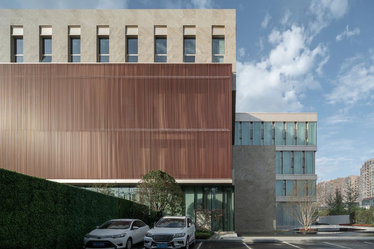 立面材料分兩個主要元素,入口處運(yùn)用米黃色石材和鋁合金格柵幕墻的交織,整體色彩協(xié)調(diào)性較好,實(shí)體墻和半透明材料的交替形成表面的韻律。表皮以統(tǒng)一而富有變化的造型帶來強(qiáng)烈的視覺沖擊,營造出一個潔凈的環(huán)境同時又是相對較為素雅輕奢的立面。