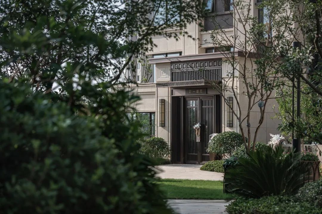 住宅單元入口以近4米的門頭高度,全石材加仿銅拉絲不銹鋼,雕琢出歸家的儀式感。提取中式祥瑞元素,利用祥云符、如意符、回字紋及錦紋,營(yíng)造尊崇感。