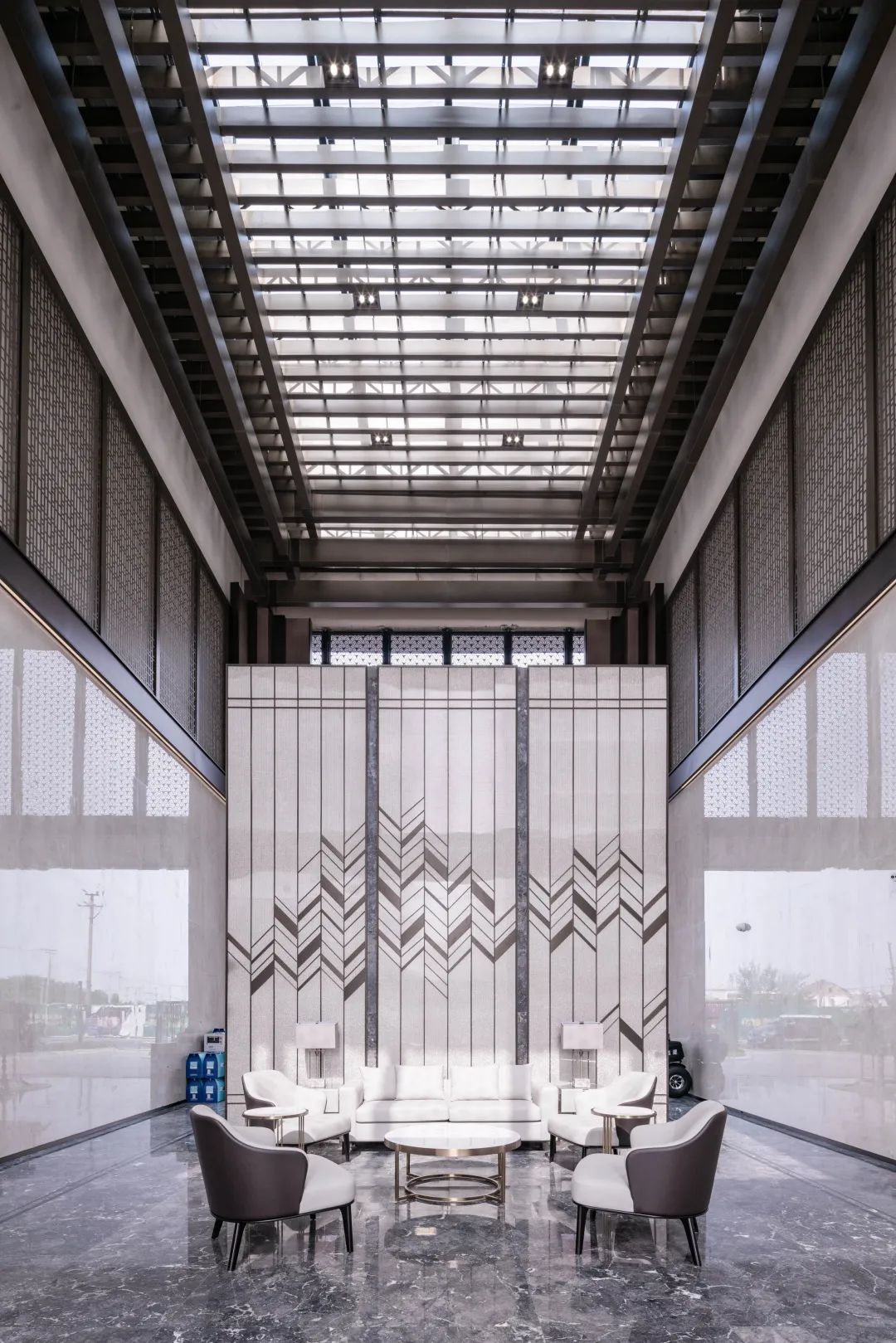 屋頂金屬鋁格柵與彩釉玻璃相得益彰,體現(xiàn)建筑的現(xiàn)代感與精致感。