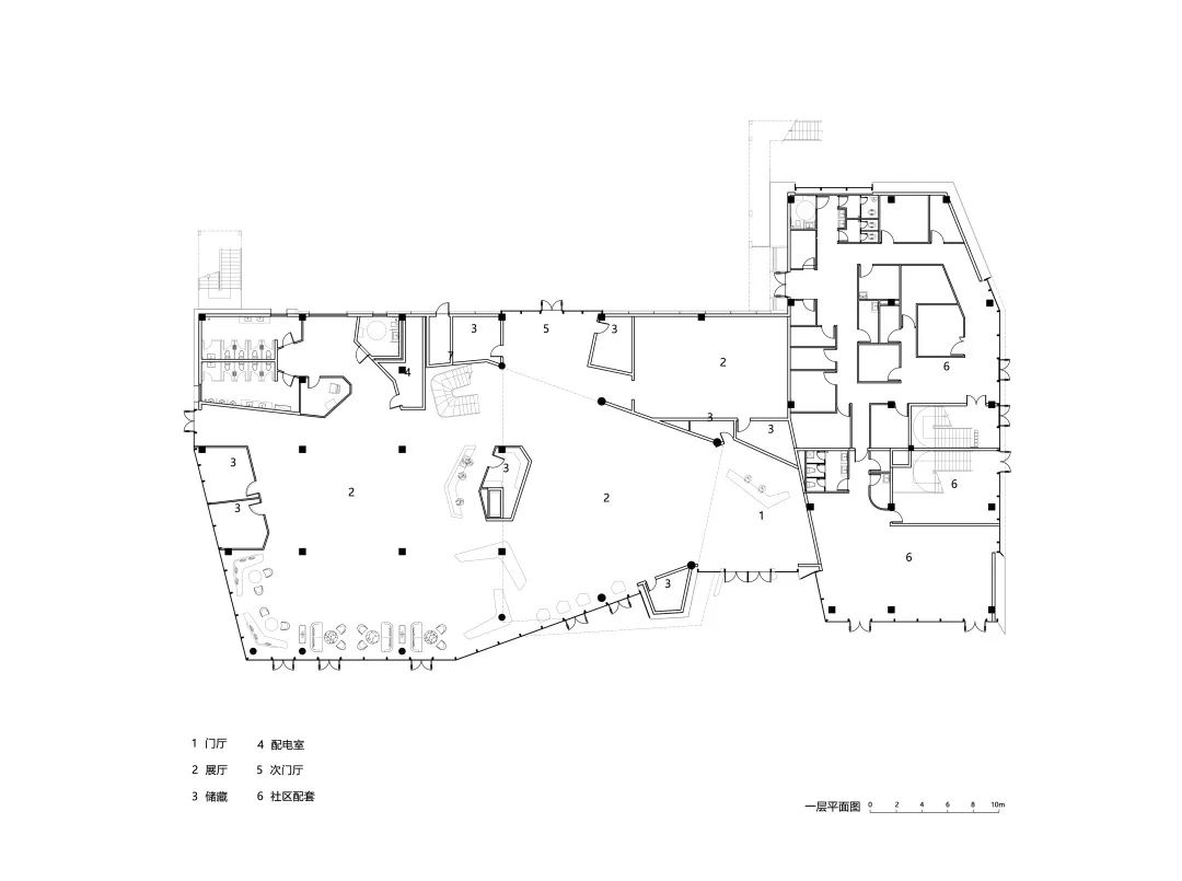 建筑兩部分的轉(zhuǎn)角開口,形成了一個梯形的入口廣場。由此進入經(jīng)過門廳,來訪者可以順著幾何空間不斷向上,參訪兩層的各個主題展廳。展廳的主題則主要關(guān)注于科學和技術(shù)相關(guān)的內(nèi)容,并設(shè)置了可供年輕游客參與的互動裝置,寓教于樂。