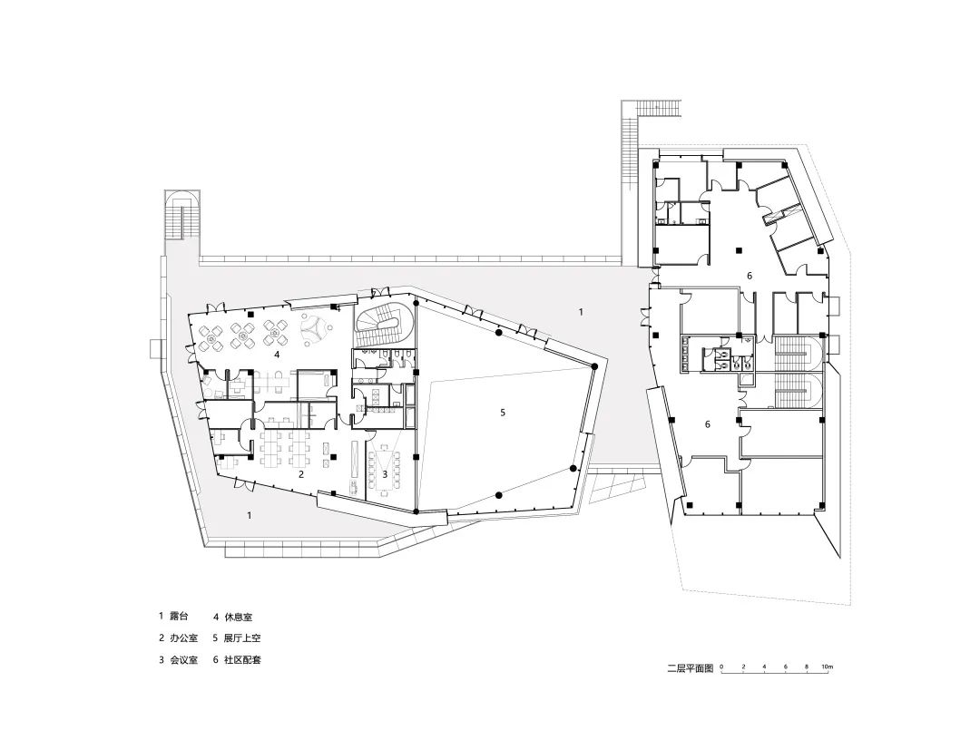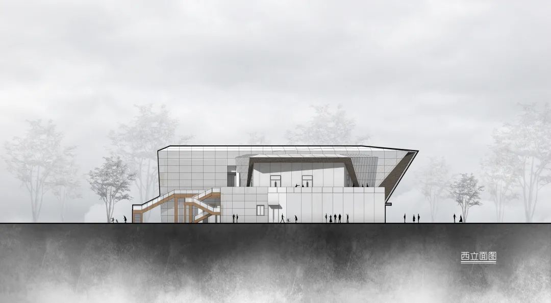 在二樓兩個體塊間預留預留露臺空間,來訪者可以到達建筑的屋頂露臺,從而欣賞萬豐湖濕地公園的全景風貌。并于露臺預留架設(shè)天文望遠鏡的空間,游客可于此仰望滿天繁星。