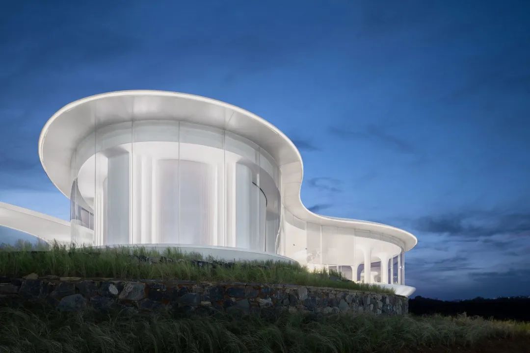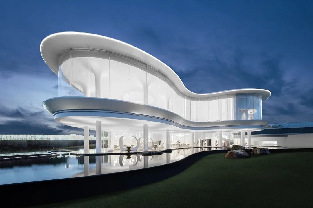 建筑溫柔簡(jiǎn)約的流線造型展現(xiàn)出更寬廣的包容性,潔白的云朵完全去除了地標(biāo)建筑自有的張揚(yáng)侵略感,創(chuàng)造出與山巒、河流共存的一片云。