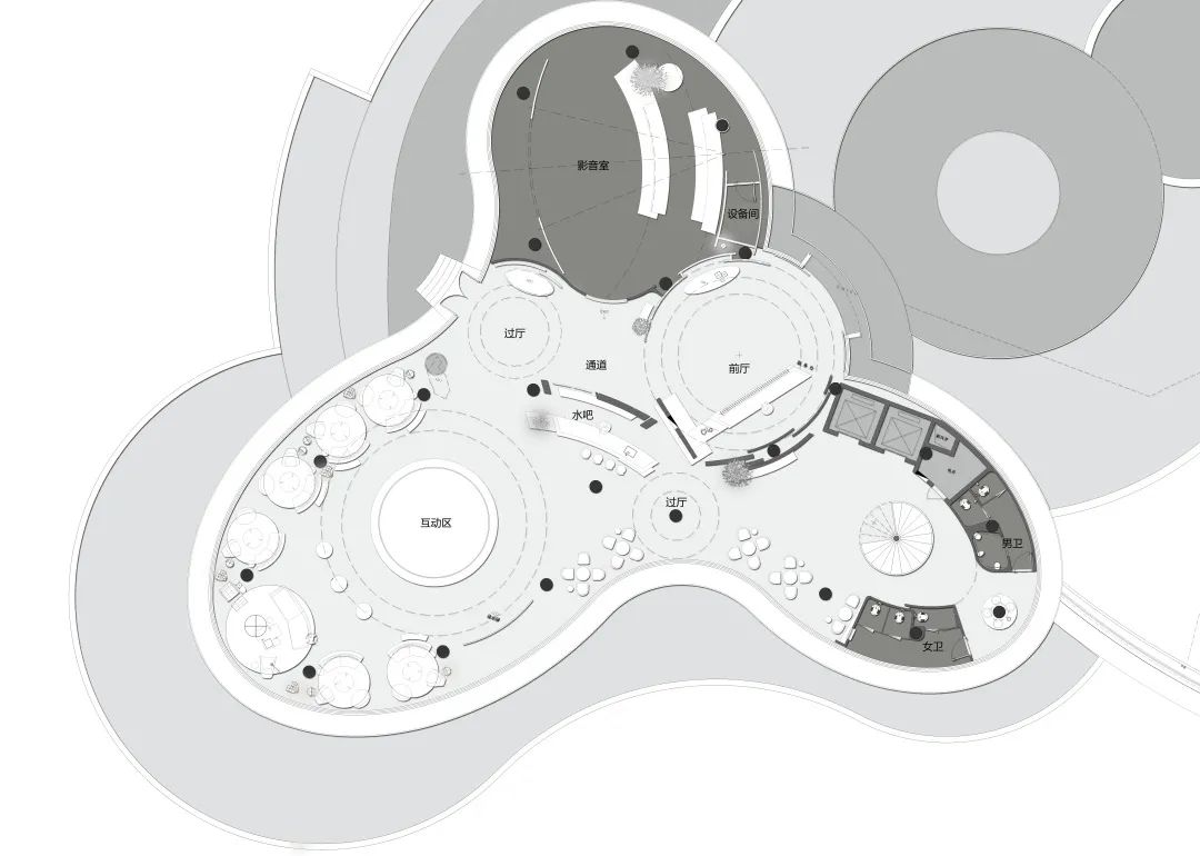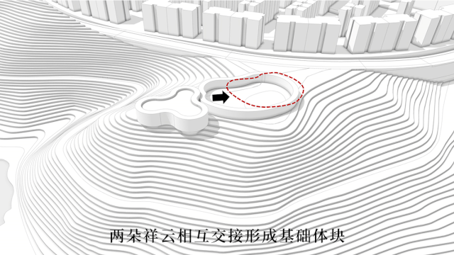 設(shè)計(jì)取意傳統(tǒng)文化中的祥云符號(hào),加以抽象提取,形成獨(dú)有的云朵造型。流暢的建筑形體加深了和環(huán)境的結(jié)合度,面向老馬河的角度細(xì)致推敲,避免周邊山頭的干擾,盡可能的使得視線穿透樹(shù)影到達(dá)水面。