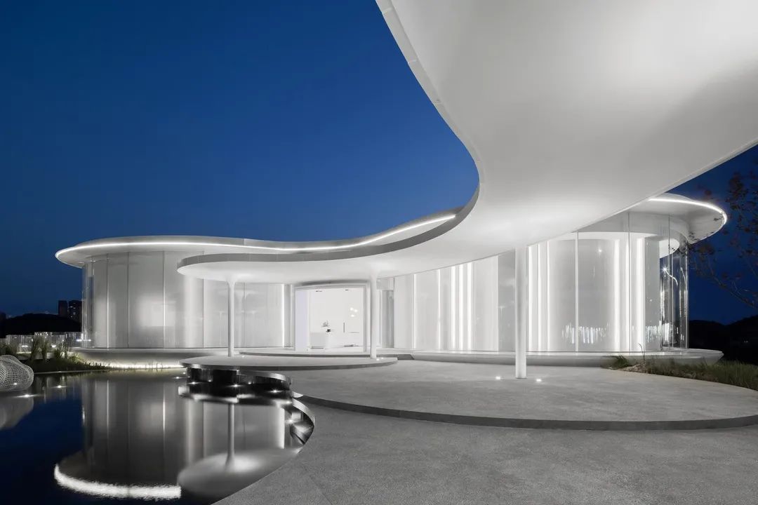 建筑四周完全連續(xù)的玻璃面將室外多維度的景觀滲透到視野內(nèi),使得山、水、景相互交融。整體建筑輕盈通透、色澤柔和,結(jié)合內(nèi)斂的底座空間,更顯藝術(shù)館的氣質(zhì)靈動(dòng)飄逸。