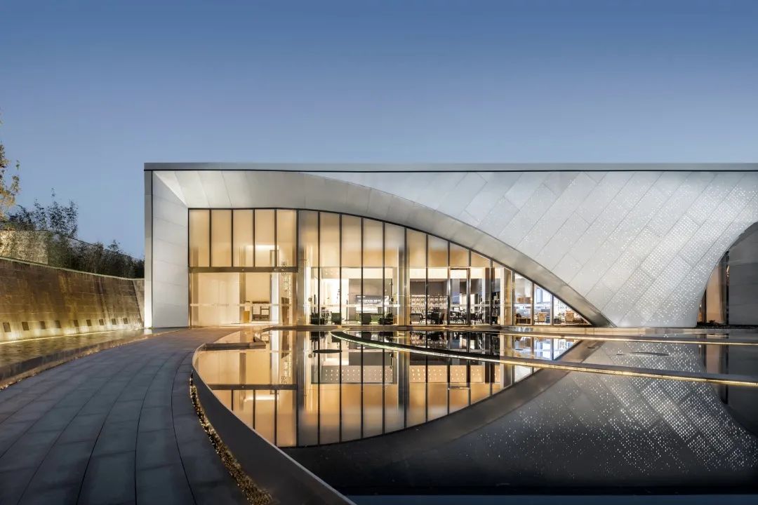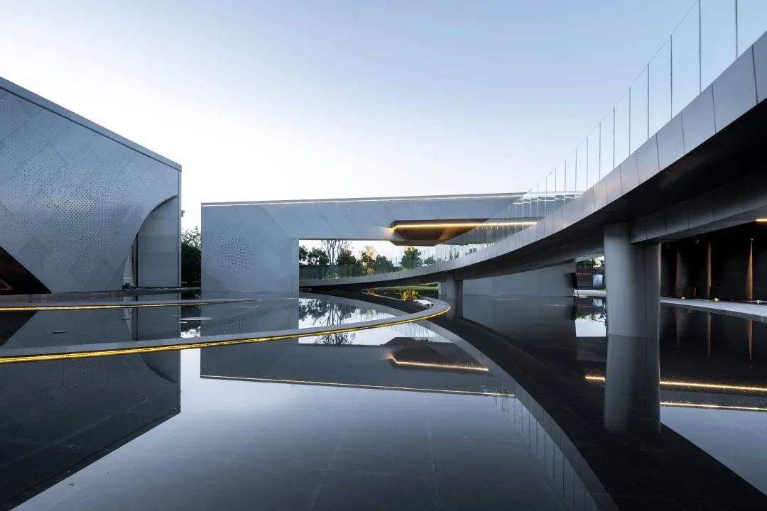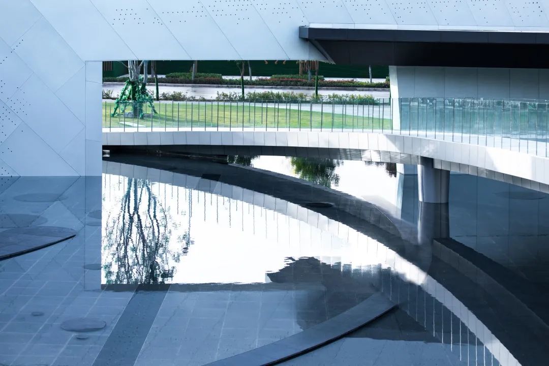 空間與視覺的連續(xù)性:立面的墻體通過藝術(shù)創(chuàng)作產(chǎn)生視覺上的肌理感,將光與影帶入到空間中,微風(fēng)拂過水波倒影連廊起伏,層層漣漪之上倒映出朦朧的樹影與建筑。運用玻璃等半透明材料,舒朗別致的造型結(jié)構(gòu)打破景觀與建筑的界限,打造空間與視覺的連續(xù)性與純凈性。