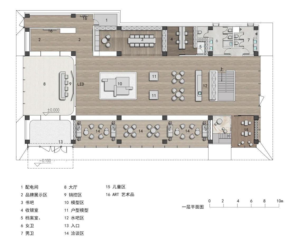 多空隙空間:挑高的回廊空間,橫向的尺度將空間的線性感完美的體現(xiàn)。半透的玻璃界定著空間,透漏著光影與空間,同時作為載體描繪著線性構(gòu)成的光的語言。充分利用灰空間實現(xiàn)建筑與景觀的柔和過渡,使兩者成為自然而有機的整體。