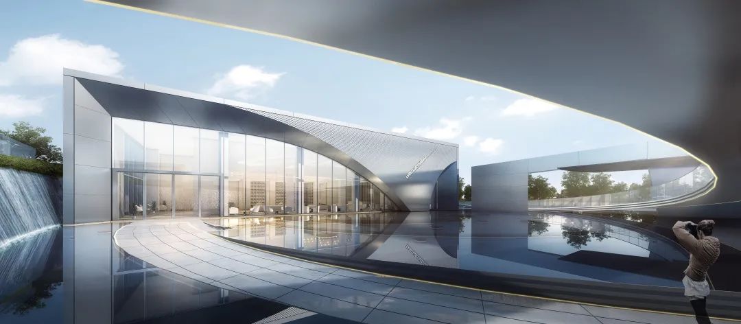 獨特的示范區(qū)入口門頭設(shè)計,三角形交錯切割搭的頂蓋搭配弧與圓變形拼接的墻體,選用與建筑表面相同的鋁板材質(zhì),讓每一個到訪的客戶都能體會到尊貴大氣的儀式感。大門整體框架為線條設(shè)計感十足的多邊幾何形,肆意張揚的角,似無限延伸的線,百變的面富有動感?!坝薄ⅰ熬邸?、“觀”一氣呵成。整體為黑白色調(diào),純粹簡約,同樣不缺少高級質(zhì)感。從內(nèi)延伸至外的水面,倒映著藍(lán)天白云,似天地顛倒闖入一片幻境,似夢而非夢。