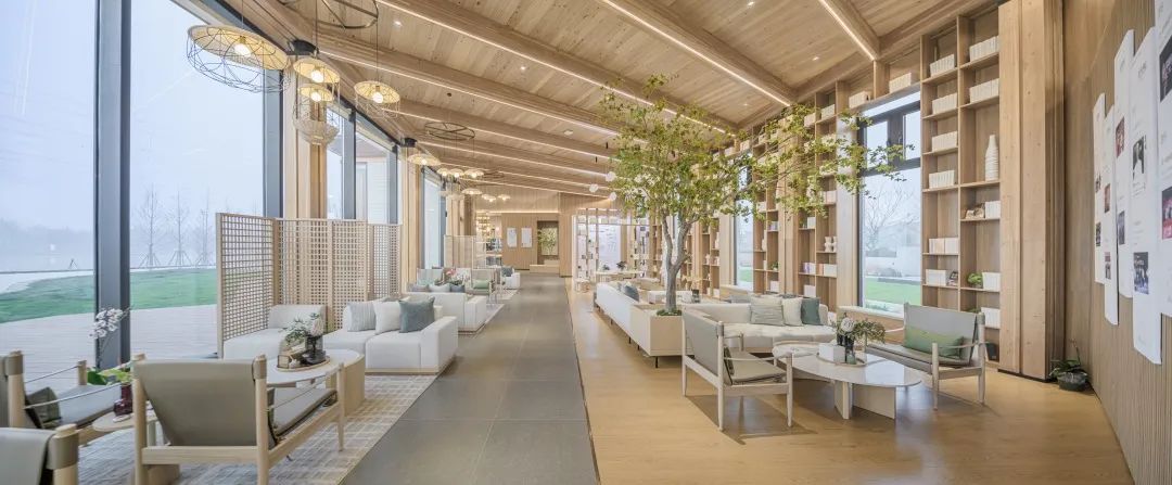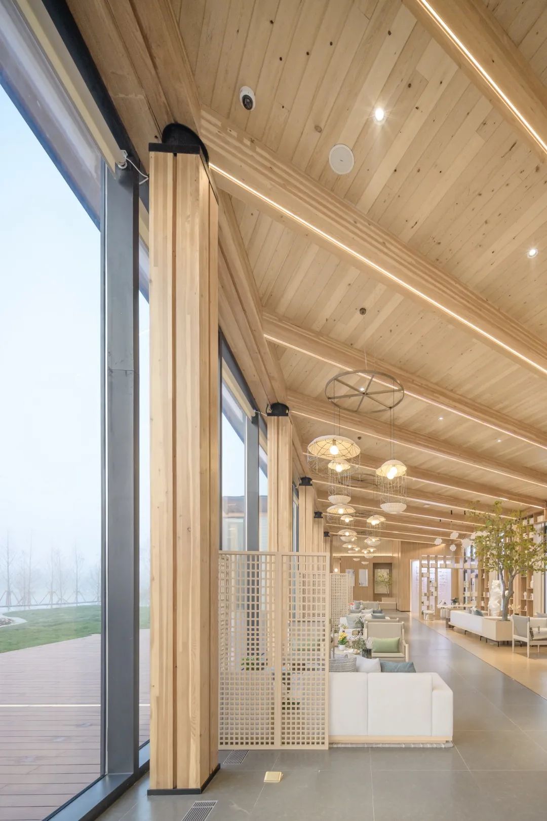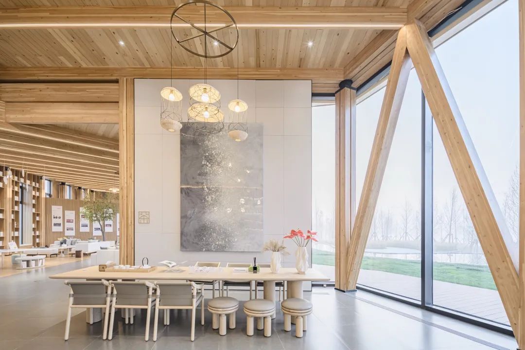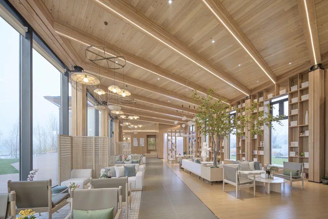 項(xiàng)目著重體現(xiàn)自然、田園、舒適的空間氛圍,重點(diǎn)詮釋木結(jié)構(gòu)空間完整性和體現(xiàn)木結(jié)構(gòu)梁柱的序列感,通過開敞的空間布局方式,營造出空間與建筑之間統(tǒng)一性,體現(xiàn)木結(jié)構(gòu)空間張力與自然美學(xué)氛圍。