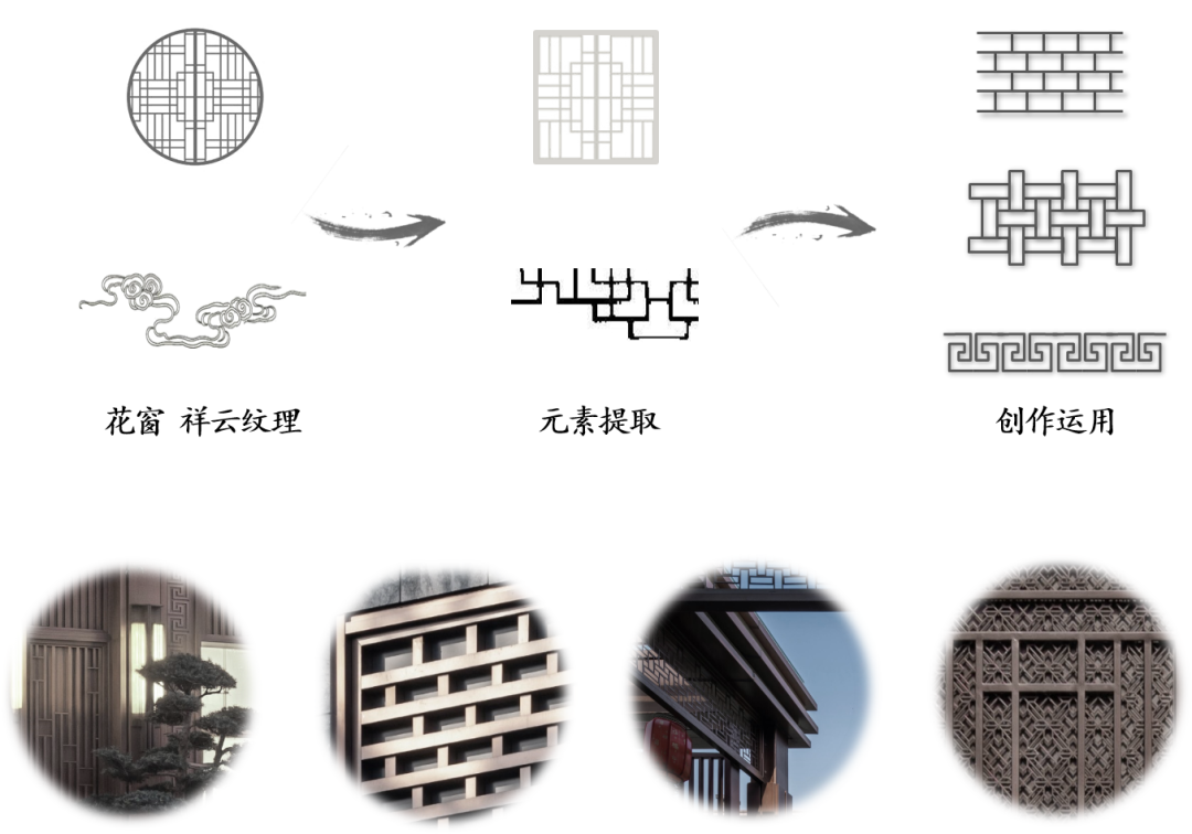 巧妙地在或高或低的圍墻、建筑實(shí)墻面上配以鏤空的格柵,增加了通透感,豐富了立面效果,起到了美化裝飾作用。