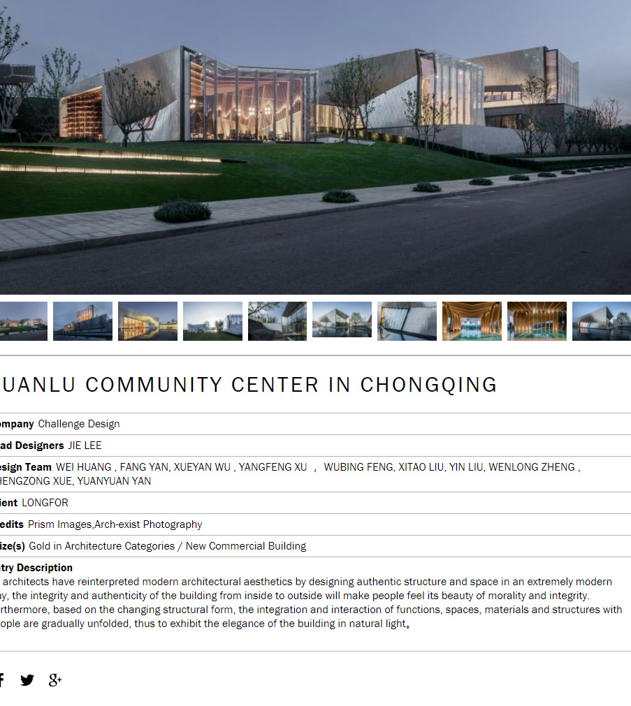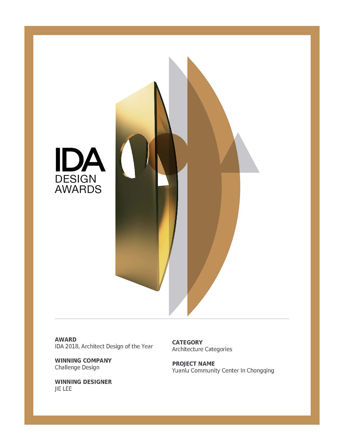 The 12th American " International Design Award(IDA)" officially announced the 2018 winners on March 1. Companies and designers from 90 countries submitted more than 4,000 projects, and the competition was fierce, and the entire judging process was very strict. Challenge Design & JAZ BUILD as the designer and builder of the project “Yuanlu Community Center in?Chongqing?” won the unanimous attention of the judges, and stood out from the many entries, winning two major awards?that the “Architect Design of the Year”(only one)and “New Commercial Building Gold Award” .? This is the project of Chinese architecture to receive this honor after the Water Cube getting the "Architect Design of the Year 2008".