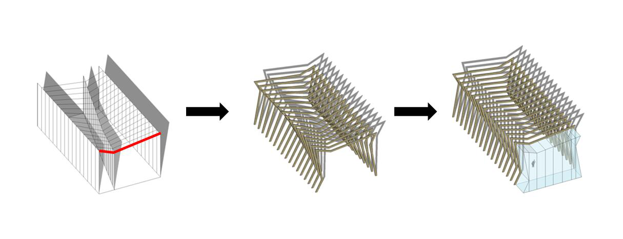 Space is inseparable from materials and structure, and is composed of building components. In this project we used glulam to create large spaces that extend over 10 meters high and 16 meters wide. Within the orderliness and rhythm there is also spatial tension. The exterior of the architecture, adapting to its structural form, unites the warping surfaces into a whole. When designing aluminum plates for the skin, we made sure the angles of each plate were well adjusted, so as to allow even the minutest changes of light to be captured by the “plates” and thus reflecting the changes of nature. In that manner the structure of the architecture, its surface and its surroundings manage to achieve an authentic, harmonious co-existence.