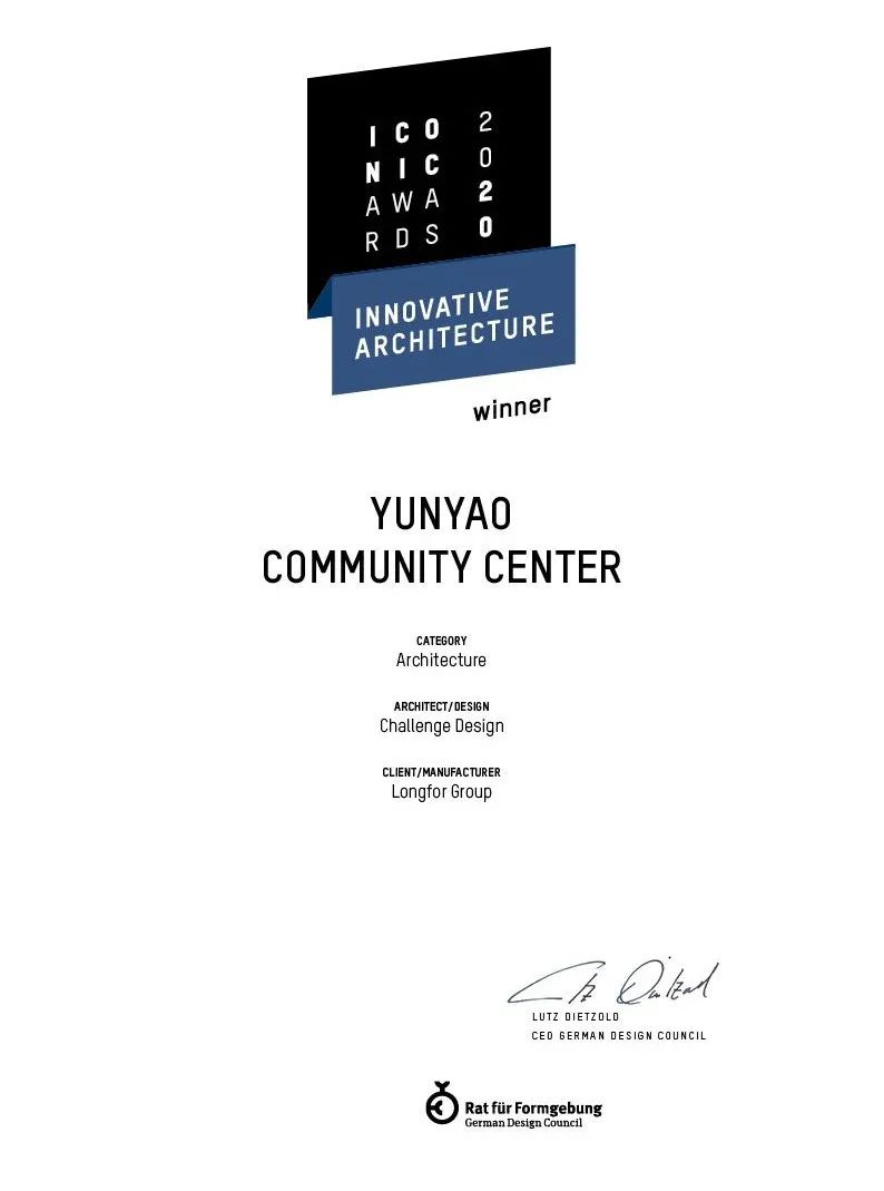 近日德國設(shè)計委員會于北京為中國獲獎團(tuán)隊頒發(fā)標(biāo)志性建筑設(shè)計獎ICONIC AWARDS,成執(zhí)設(shè)計主持的重慶龍湖云瑤玉陛社區(qū)中心項目榮獲展示建筑類(Event/Exhibition) Winner ,很榮幸能接受德國設(shè)計委員會首席執(zhí)行官及董事長 Mr.Lutz Dietzold 與大中華區(qū)首席執(zhí)行官王磊先生的頒獎。